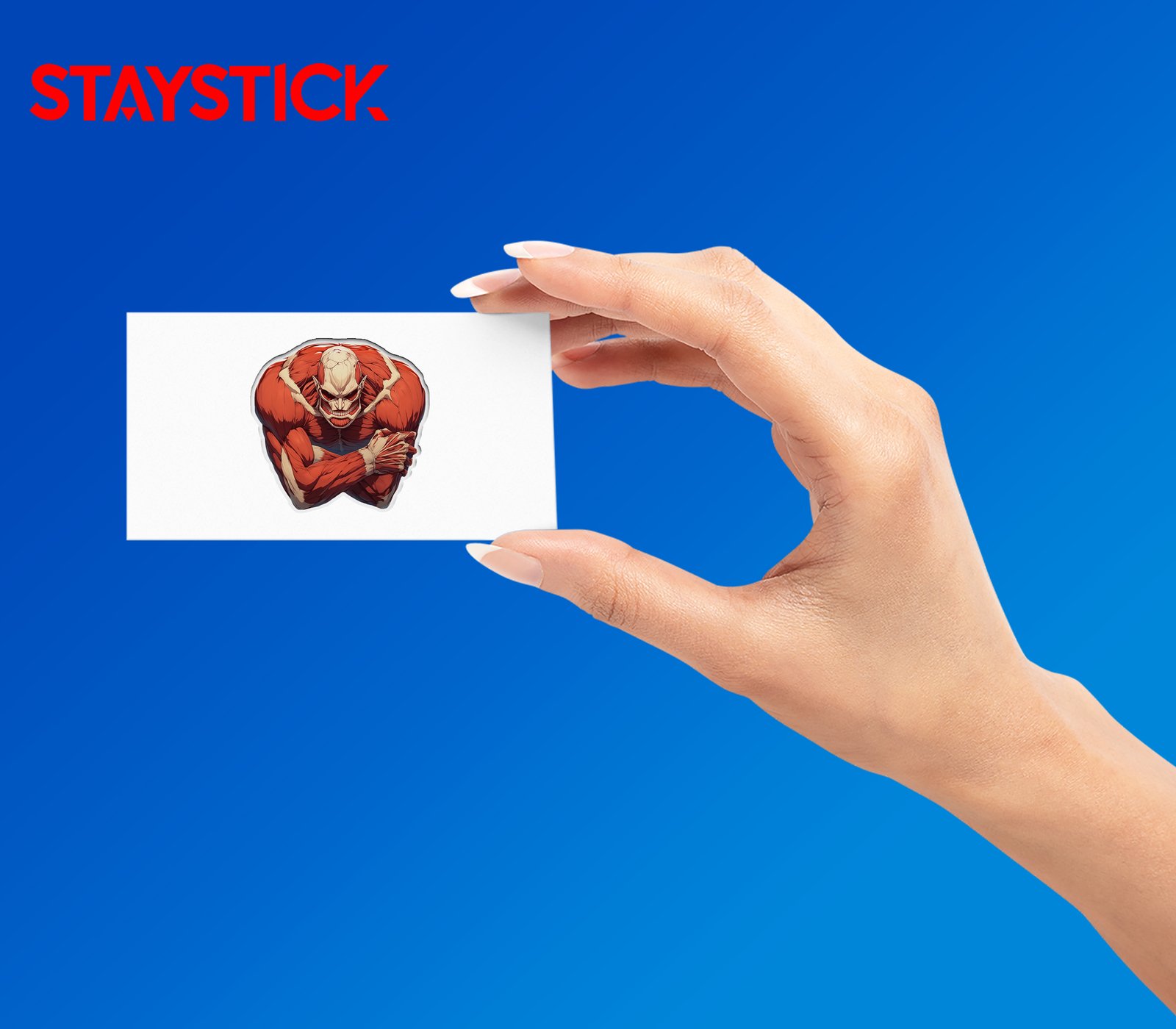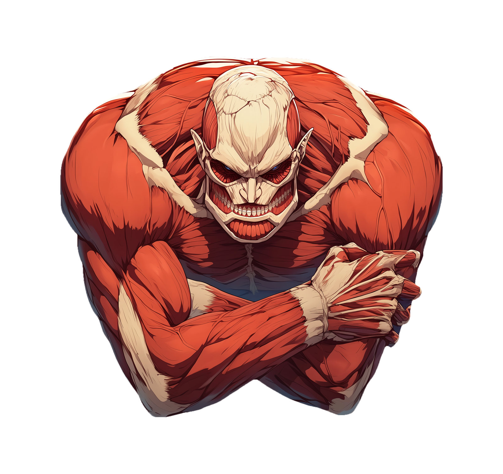 Highly detailed illustration showing sinewy muscles, bone accents, and deep shadows that emphasize the titan’s terrifying anatomy. The intense eyes and wide, toothy smile give this sticker a sinister, adrenaline-fueled energy perfect for laptops, skateboards, and collectors of dark anime art.