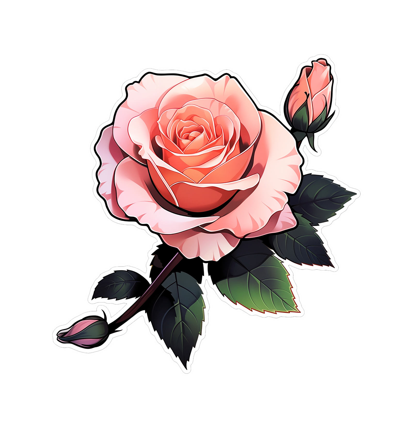 Semi-realistic vector-style rose: layered peach-to-pink petals with warm highlights, a tight bud, and contrasting dark leaves; crisp white outline for easy die-cut printing.
