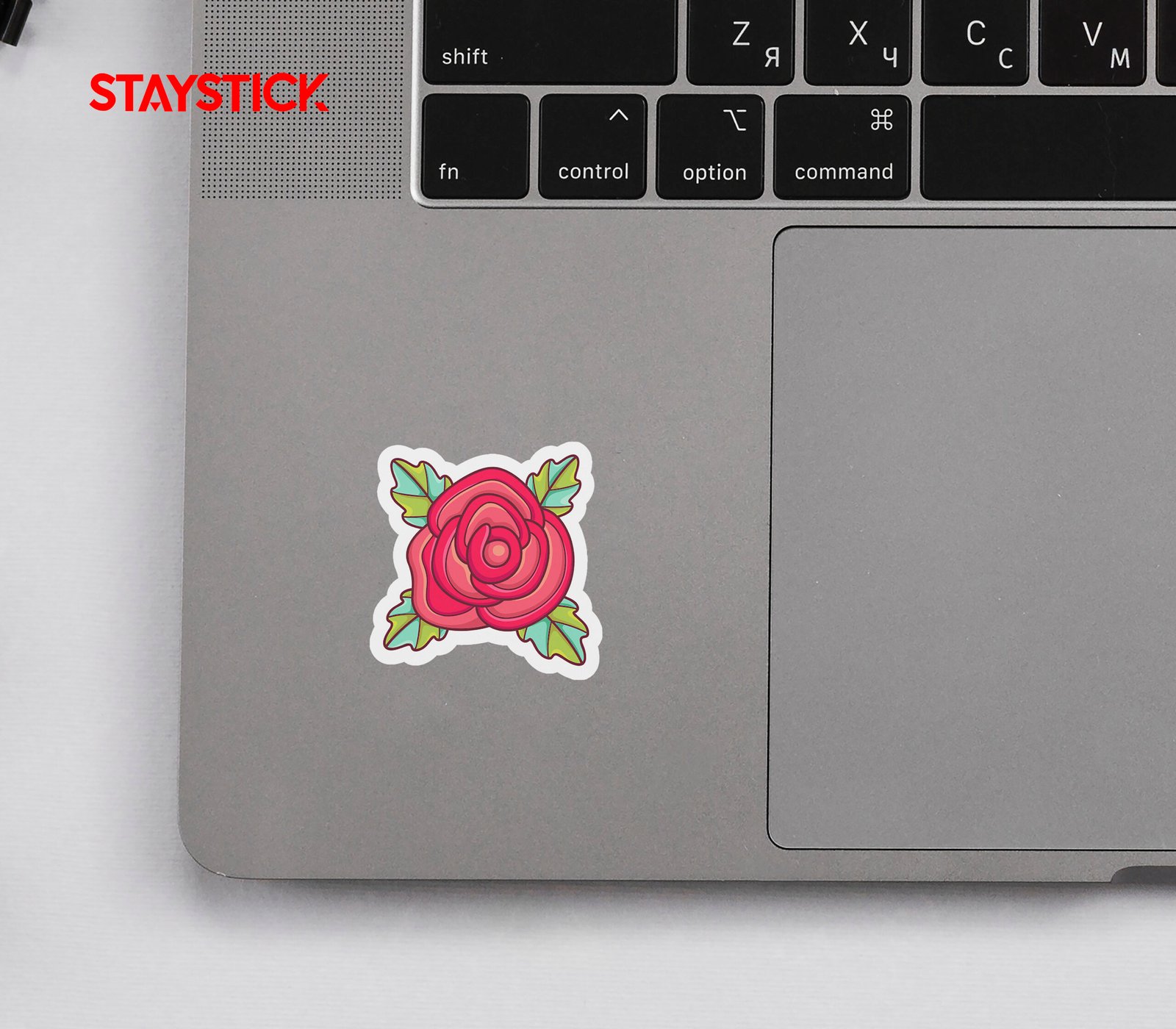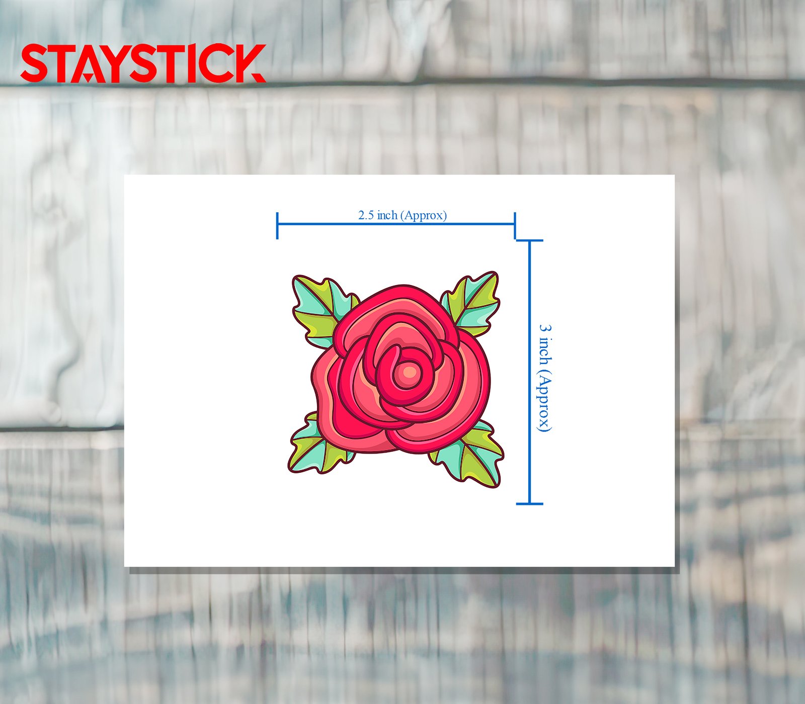 Hand-drawn inspired rose sticker showing simplified, overlapping petals shaded with warm tones and heavy contour lines; the contrasting cool-green leaves and prominent white border give it a modern, wearable-sticker aesthetic.S