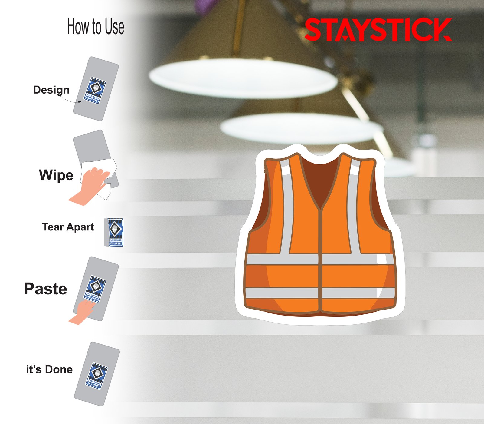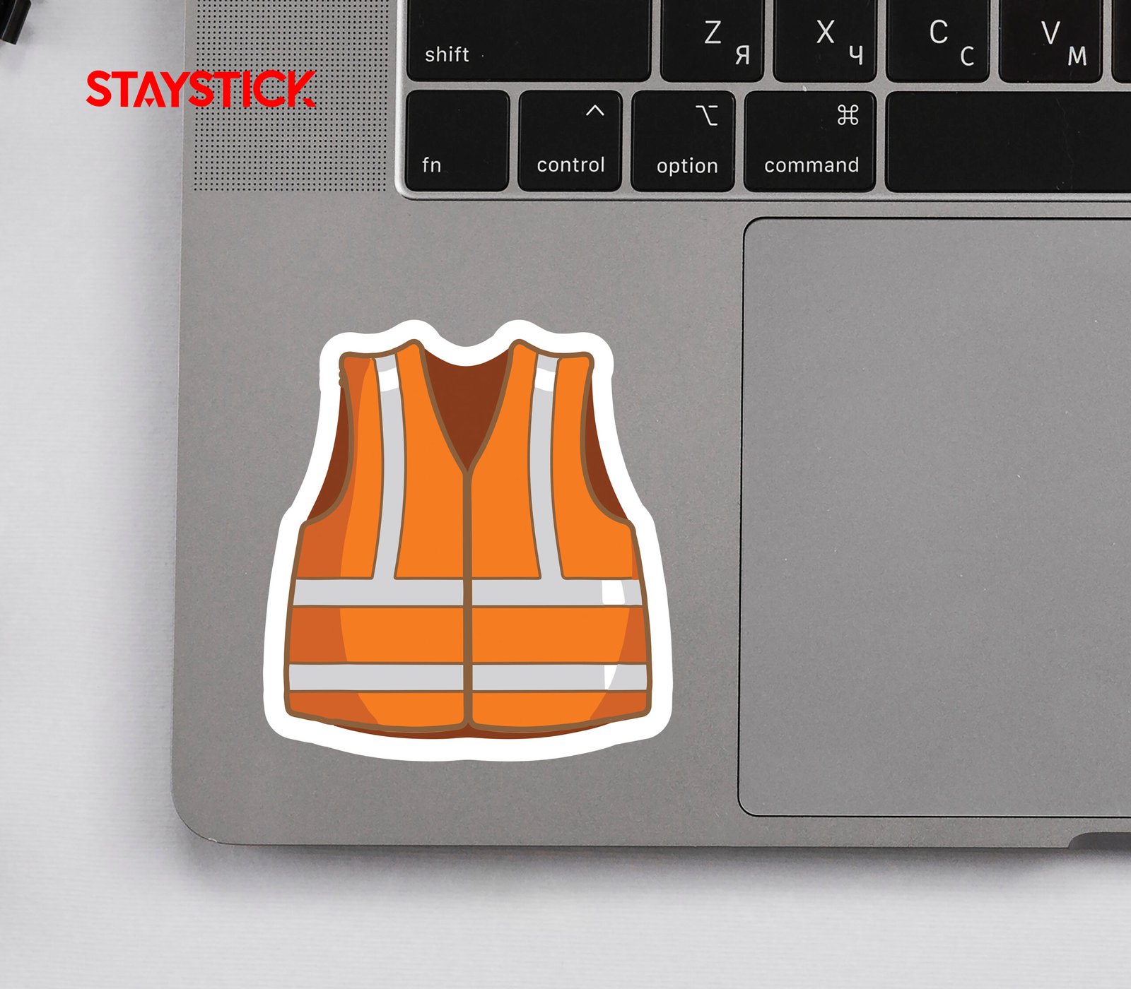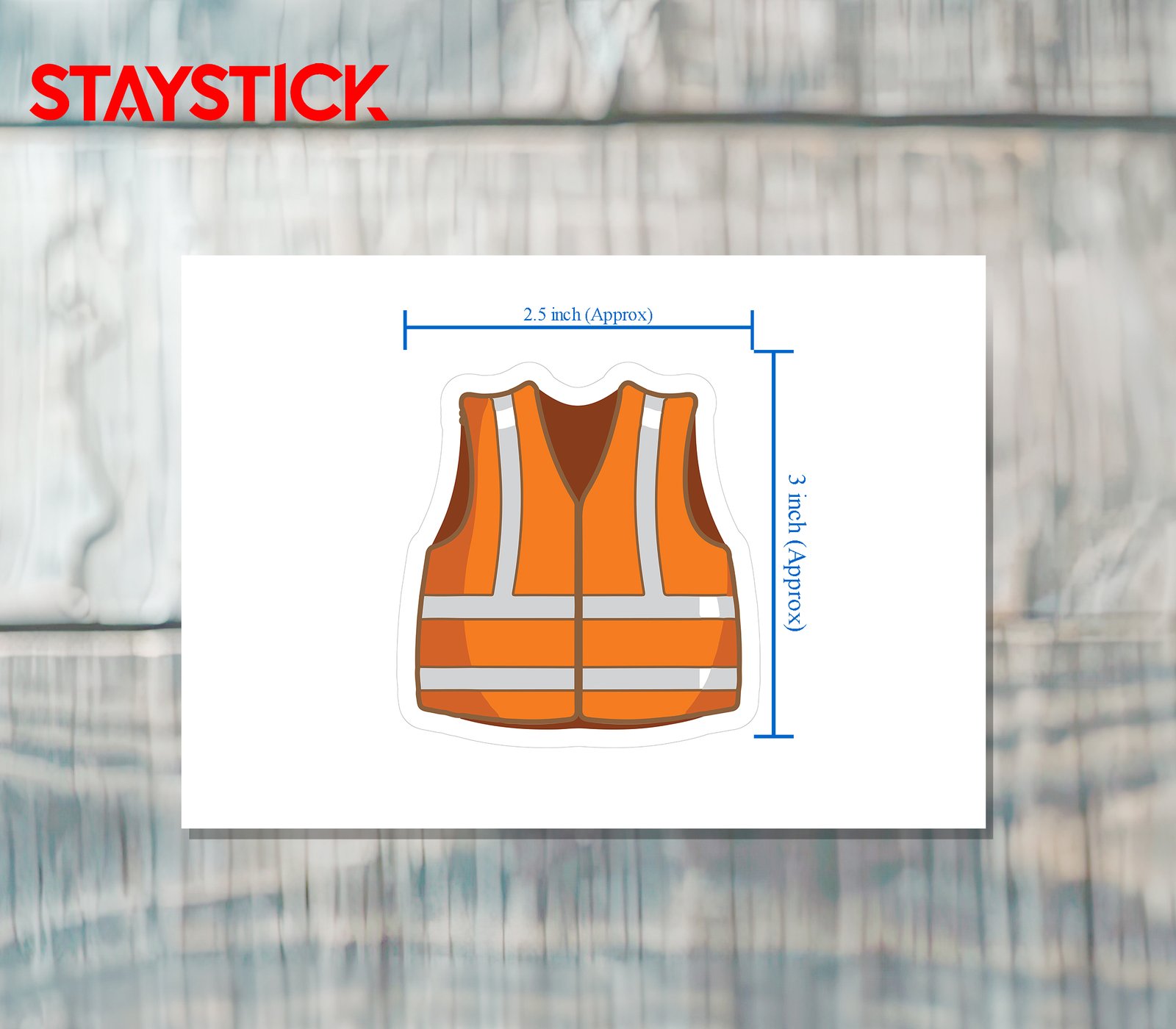 “This sticker shows an orange reflective safety vest with silver-gray stripes, designed to increase visibility in low-light or high-risk environments. It is commonly worn by construction workers, road crews, and safety personnel to ensure they are easily seen.The high-visibility vest symbolizes workplace safety, protection, and accident prevention. Its bright color and reflective strips make it an essential piece of personal protective equipment (PPE) for workers operating near traffic, machinery, or hazardous areas, ensuring both visibility and security.”