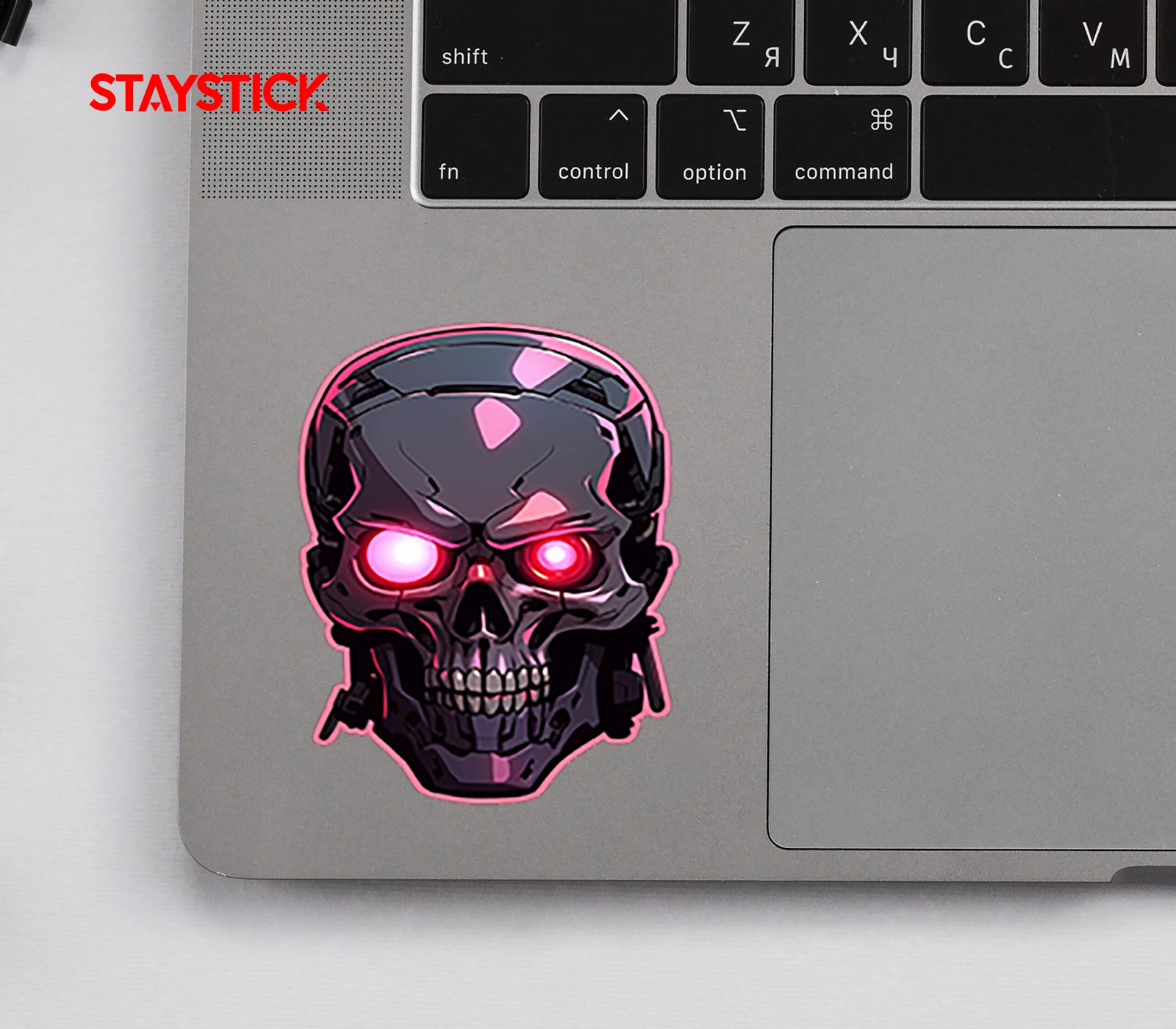 Holographic sticker of a metallic skull with glowing magenta eyes and reflective panels, blending cybernetic detail and neon highlights for a menacing, high‑contrast look.