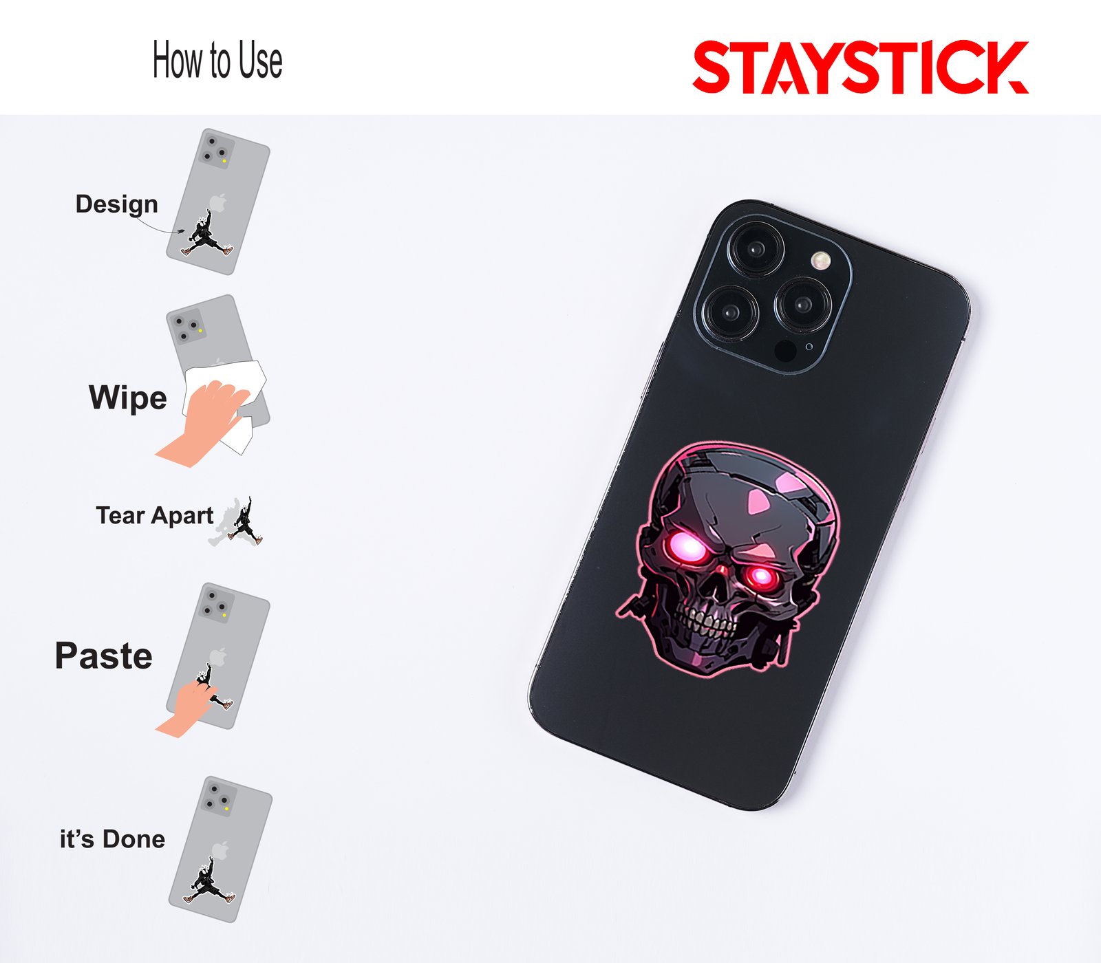 Futuristic mech-cranium decal with polished metal surfaces, exposed circuitry accents, and prismatic sheen that shimmers when tilted—perfect for laptops, skate decks, and jackets.