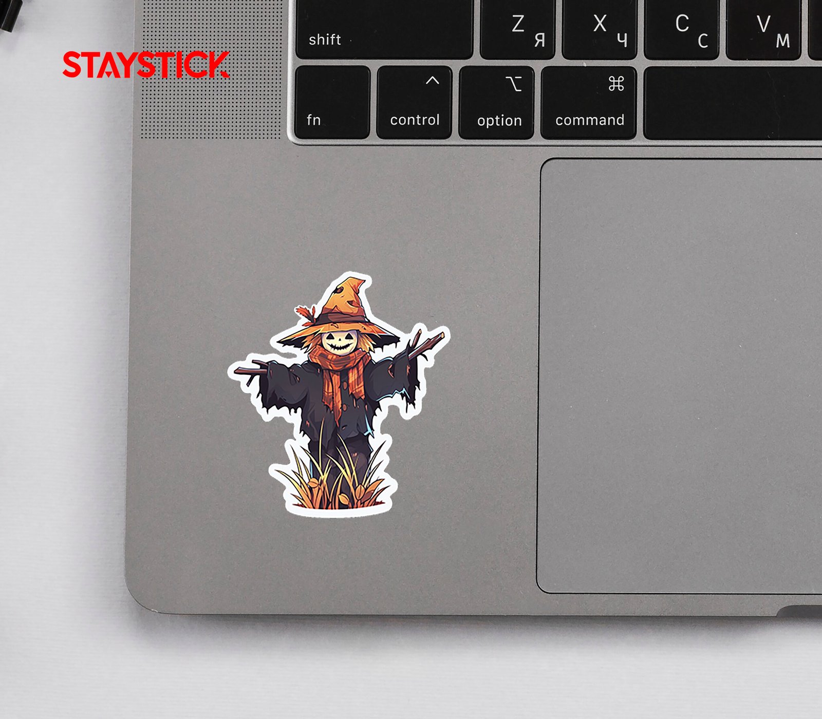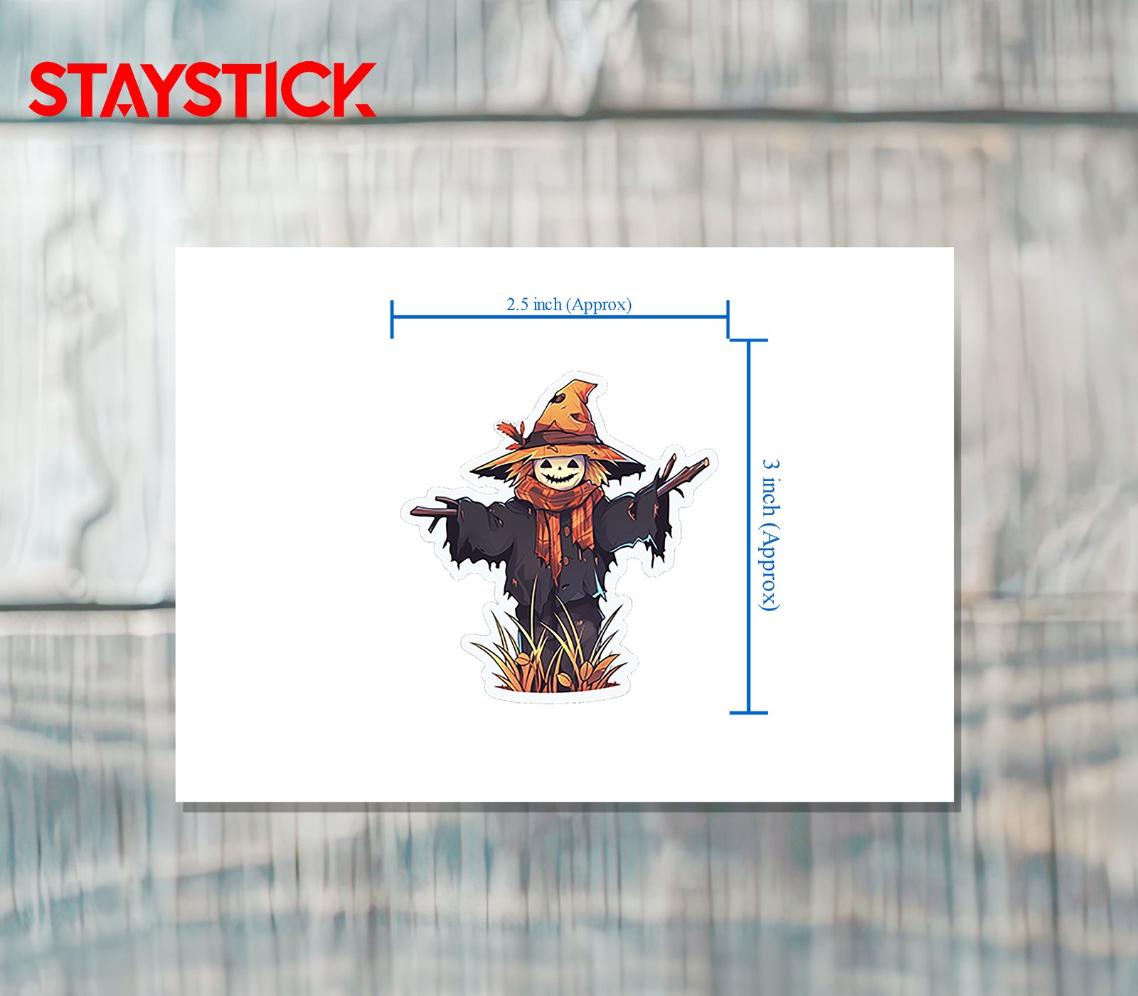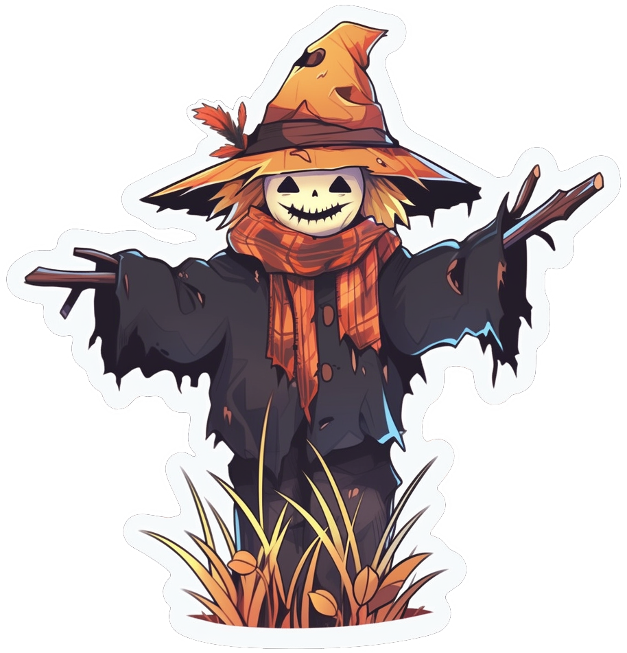 Illustrated scarecrow sticker featuring a stitched smile jack-o-lantern head beneath a worn, floppy witch hat. The figure wears a plaid orange scarf and a ripped dark coat, arms outstretched as if perched in a field. Warm autumn tones and bold outlines make the design pop on dark surfaces.