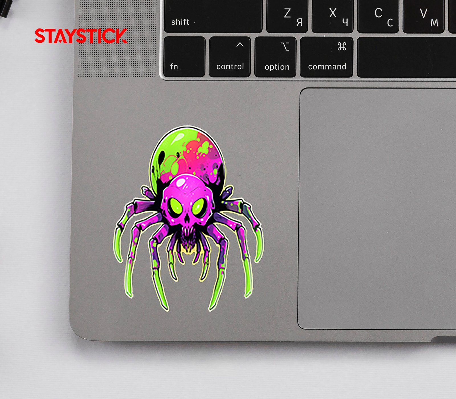 Holographic sticker of a menacing spider with a neon pink skull thorax and lime green, glowing eyes; splattered iridescent globe abdomen and dripping paint details give it a radioactive, street-art vibe.