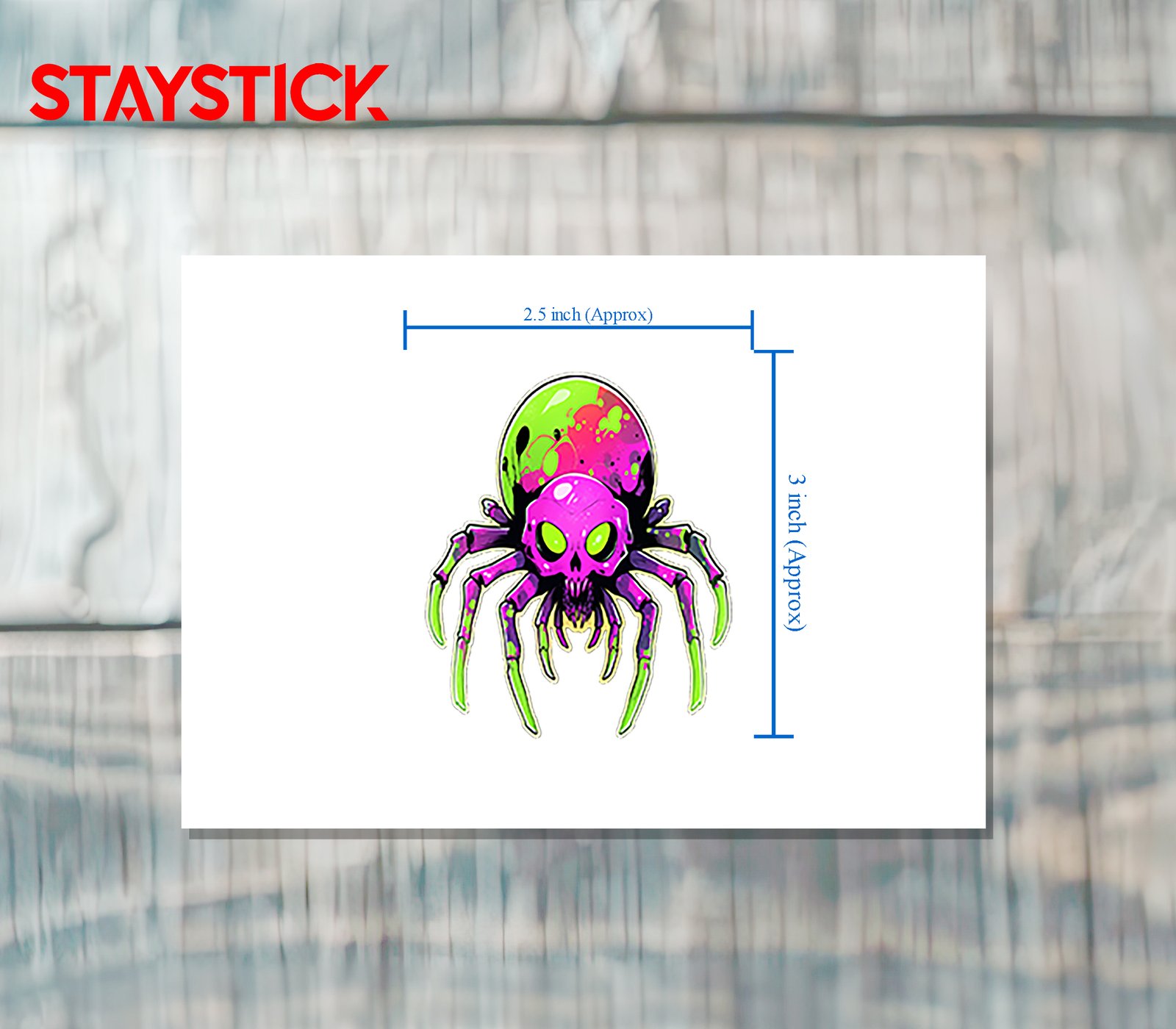 Bold, collectible decal combining horror and synthwave palettes; sharp fangs and skeletal legs read well at small sizes while holographic color shifts add depth and motion.