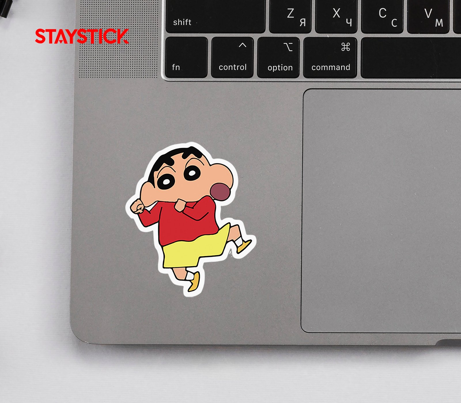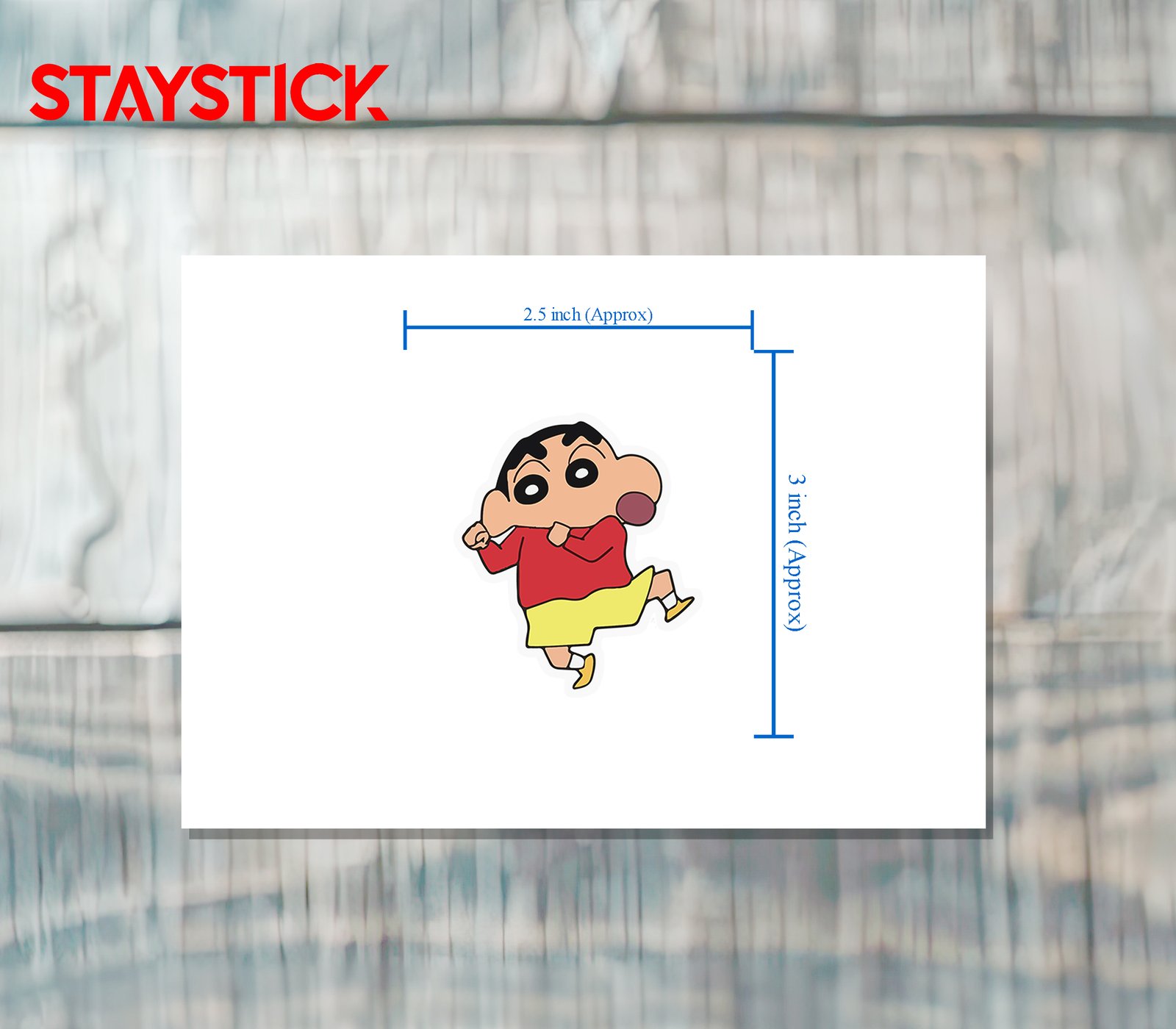 A fun Shin Chan sticker. Perfect for laptops, water bottles, and decorating your belongings.