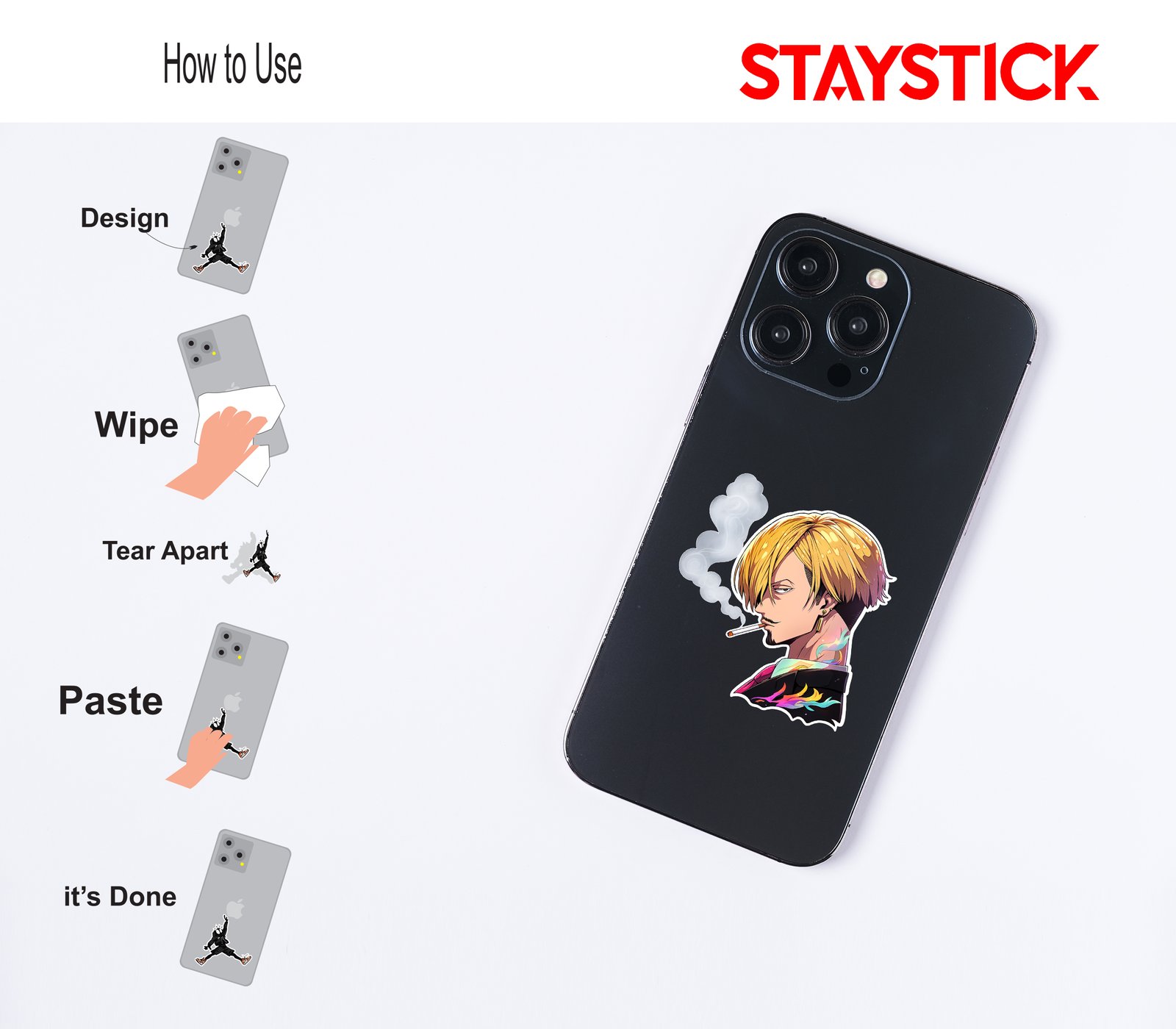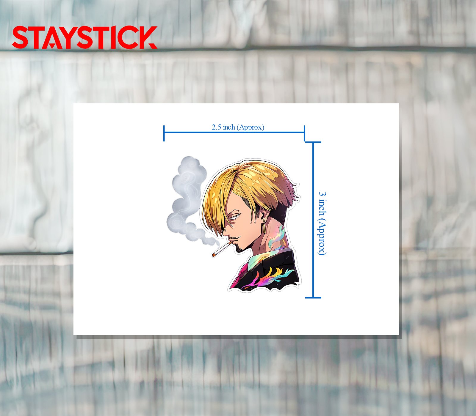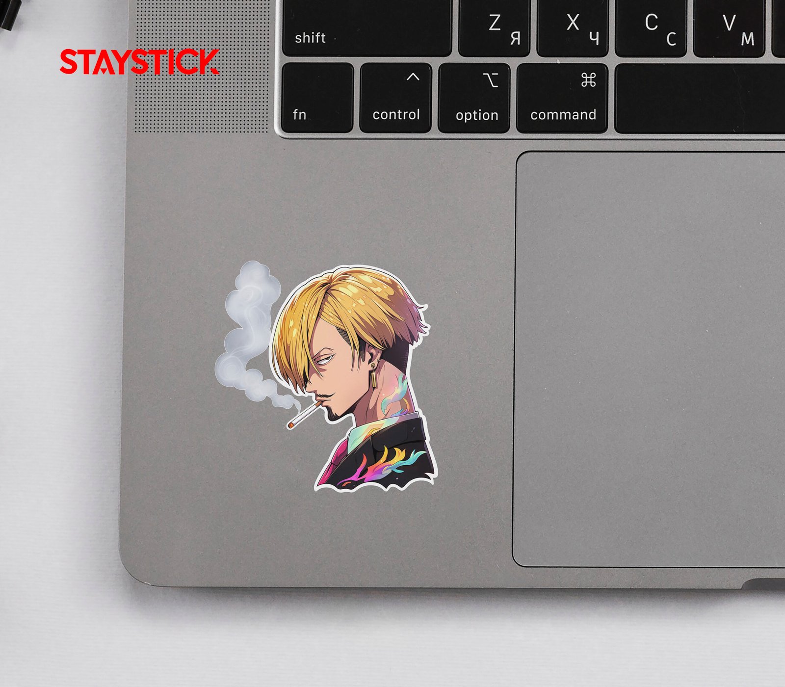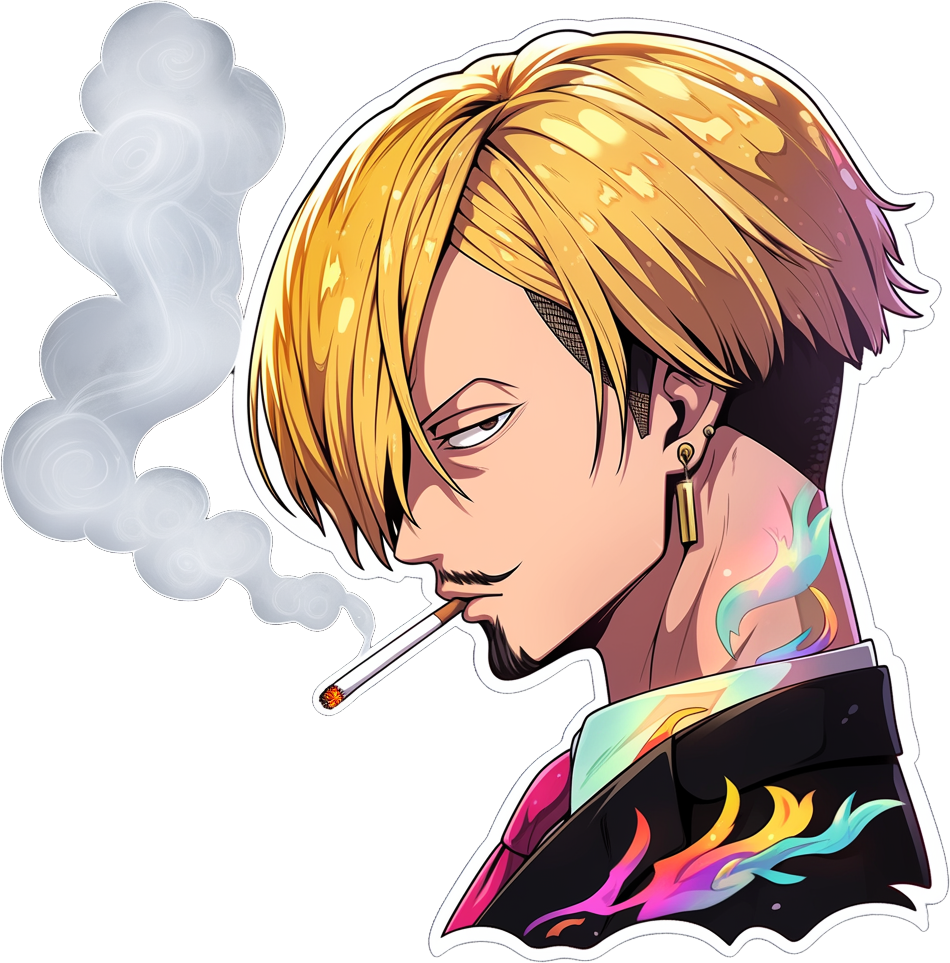 A polished anime-style sticker showing a blond man in profile, a lit cigarette between his lips trailing soft swirls of smoke. He wears a dark suit and pink tie, a gold bar earring, and vivid multicolored flame motifs on his collar and neck that contrast with the moody palette. Clean white sticker border gives a premium, cut-out finish.