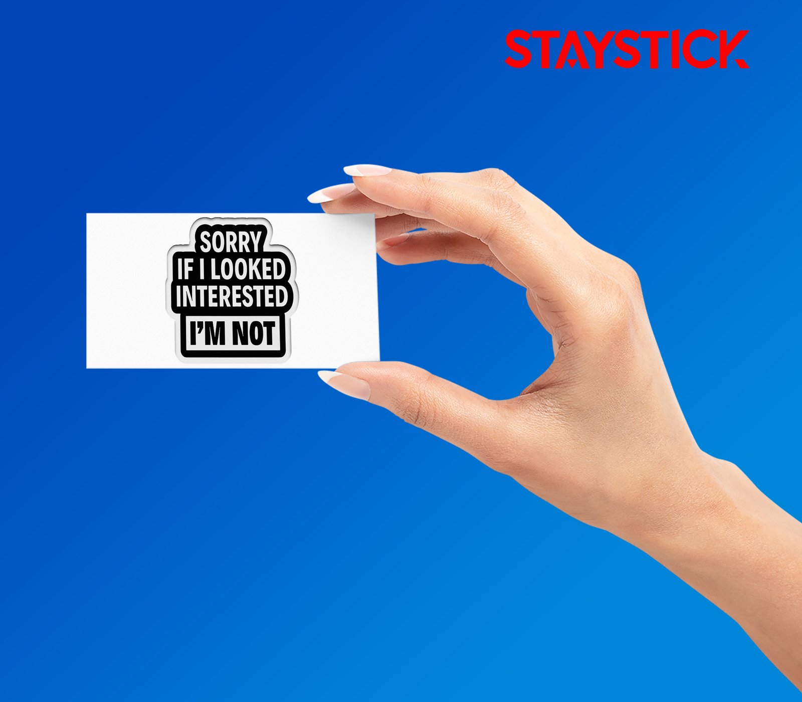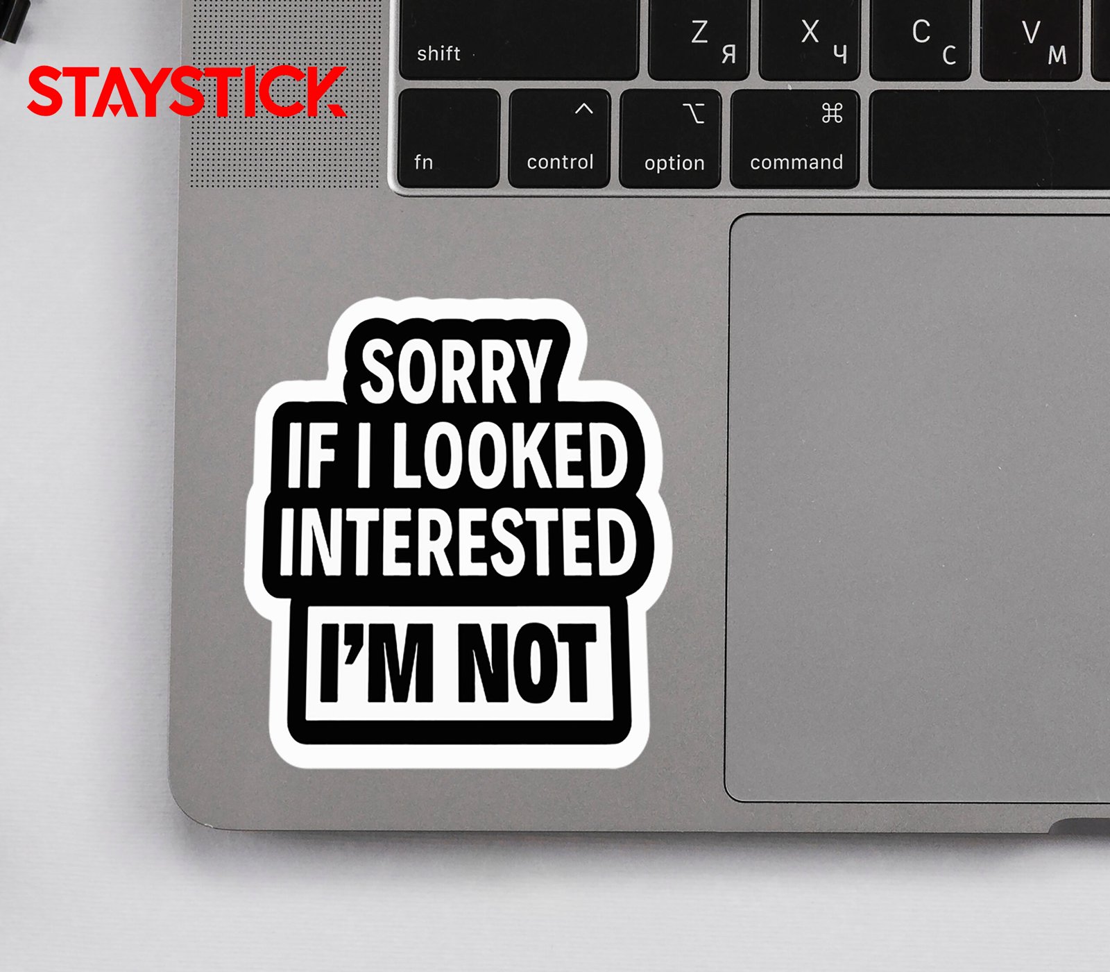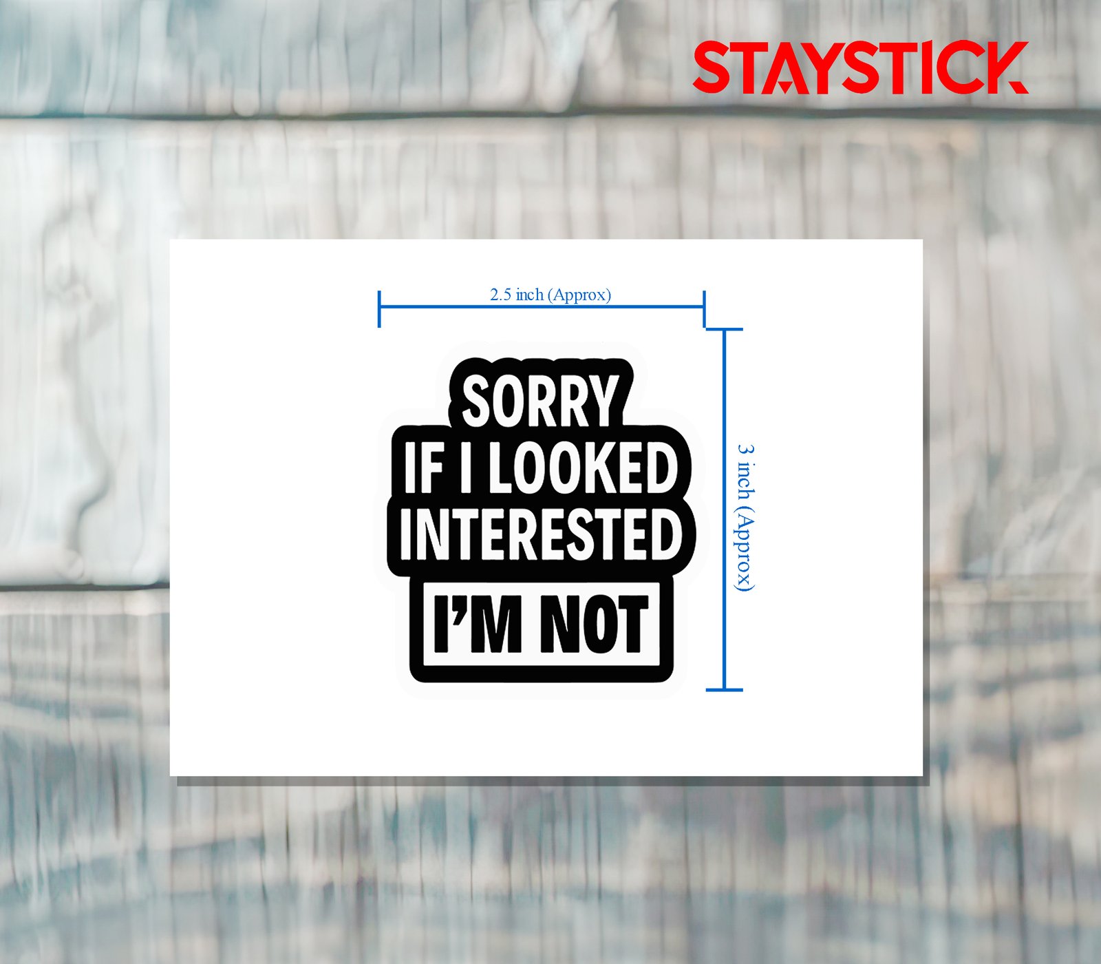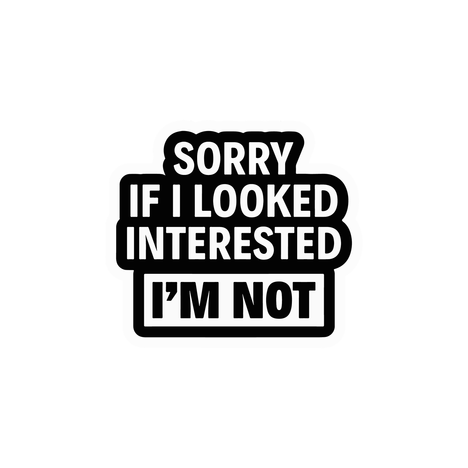 This sticker features a bold and eye-catching black background with white text outlined for emphasis. The message reads, “SORRY IF I LOOKED INTERESTED, I’M NOT”, delivered in a straightforward and unapologetic tone. Its design is clean and minimal, making the statement stand out prominently. The playful yet blunt wording makes it perfect for expressing a sarcastic or humorous personality, showing a mix of confidence and wit. It’s the kind of sticker that can be placed on laptops, water bottles, notebooks, or other personal items to showcase a fun, sassy attitude while keeping things stylish and bold.