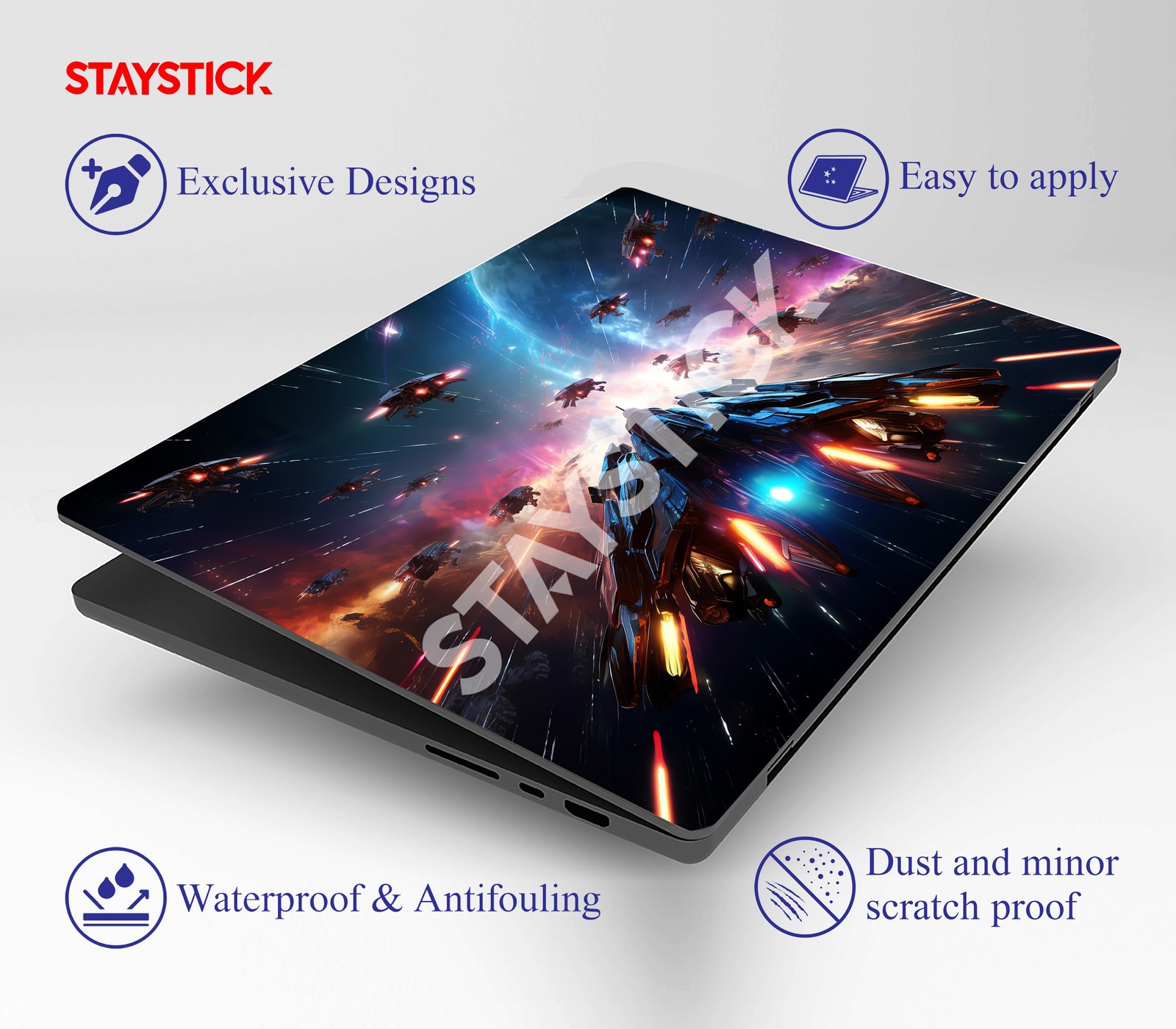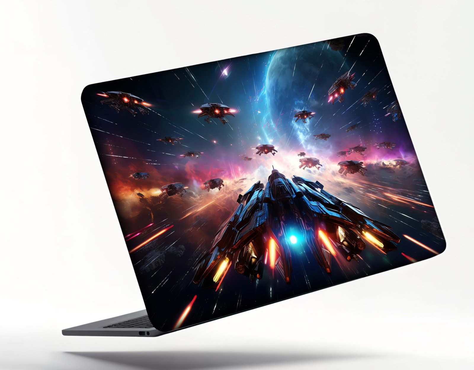 Futuristic space battle laptop skin featuring starships, galaxies, and cosmic lights. A perfect choice for sci-fi and gaming fans.”
