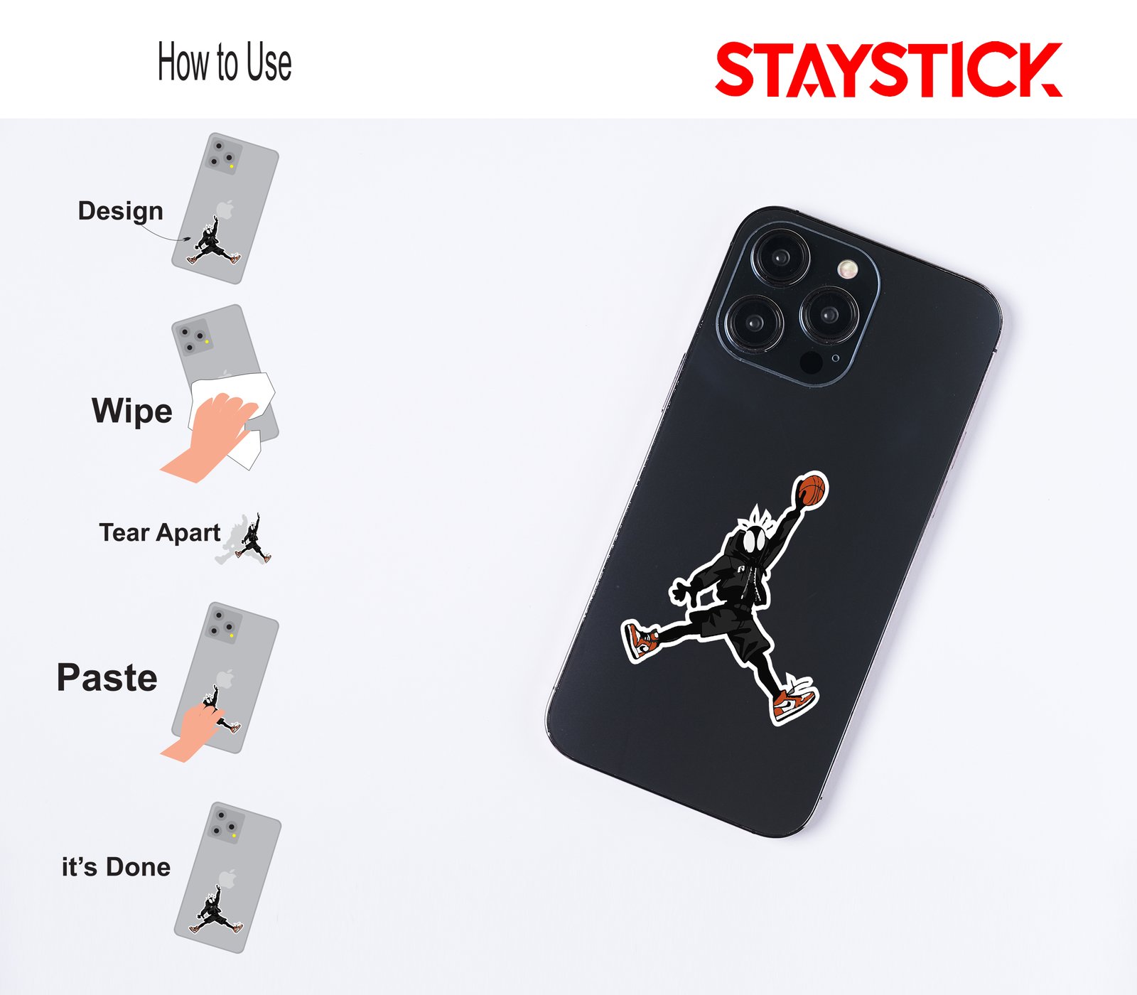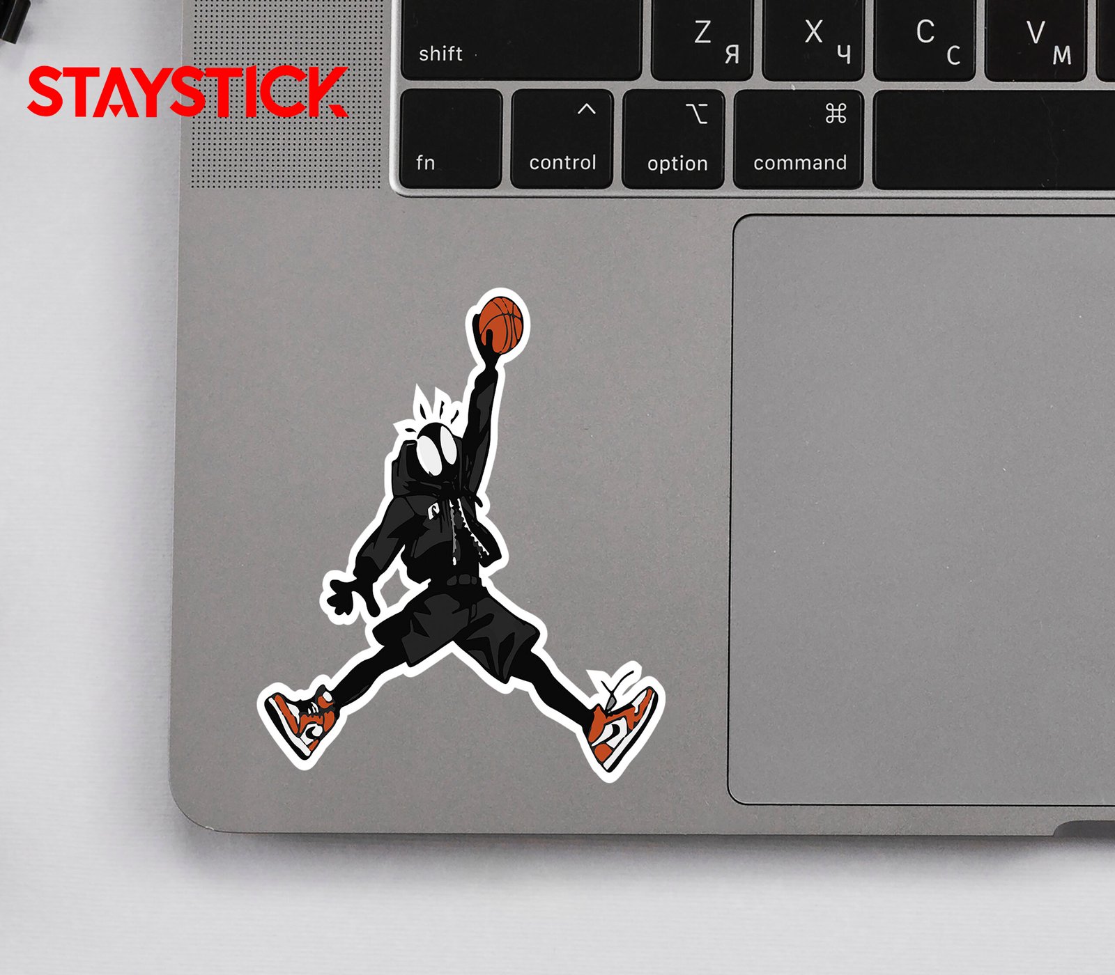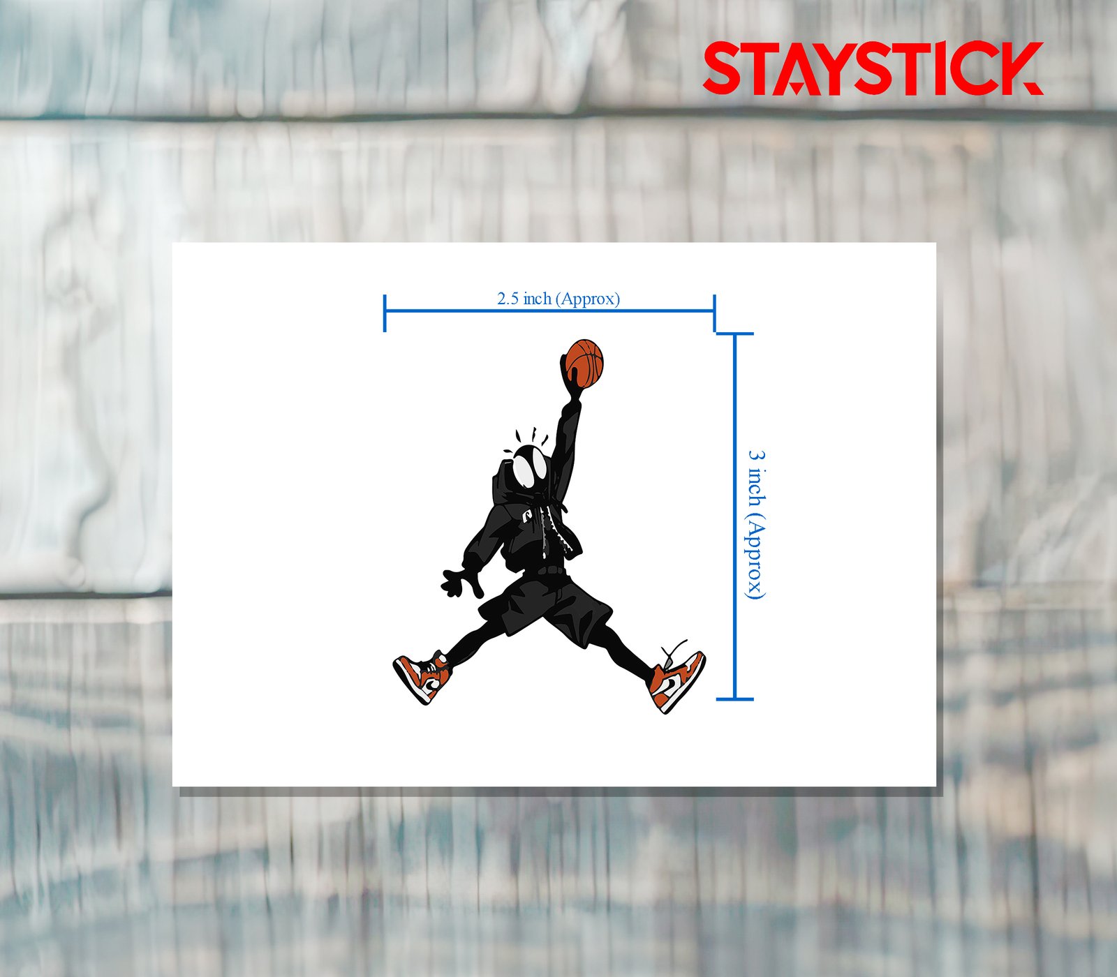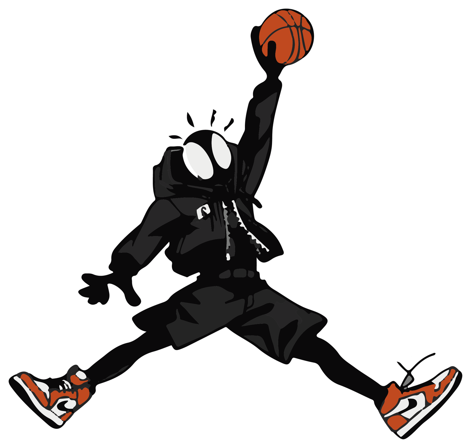 This sticker features a dynamic cartoon version of Spider-Man, styled in a unique and playful way. The character is dressed in a black hoodie with shorts, giving it a modern, urban streetwear look. Its large white eyes and spiky head details highlight the Spider-Man identity, while the pose strongly resembles the legendary “Jumpman” silhouette, symbolizing energy, style, and athleticism. The character is captured mid-air, holding a basketball high in one hand as if about to slam dunk, emphasizing strength, agility, and flair. Adding to the bold design, the character wears bright red and white sneakers, which stand out as a stylish focal point. This sticker blends superhero vibes with basketball culture, making it perfect for fans of comics, sports, and trendy street art.
