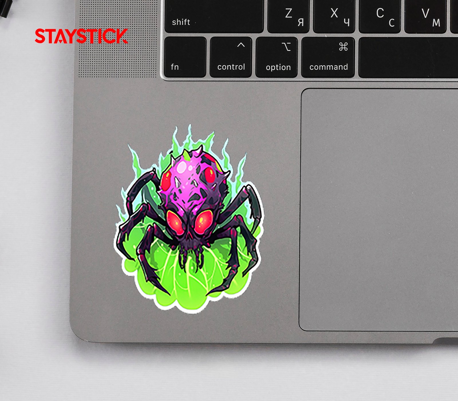 Iridescent spider‑skull with blazing red eyes, magenta carapace and a neon‑green aura—high‑contrast holo decal perfect for laptops, skate decks, and edgy merch.