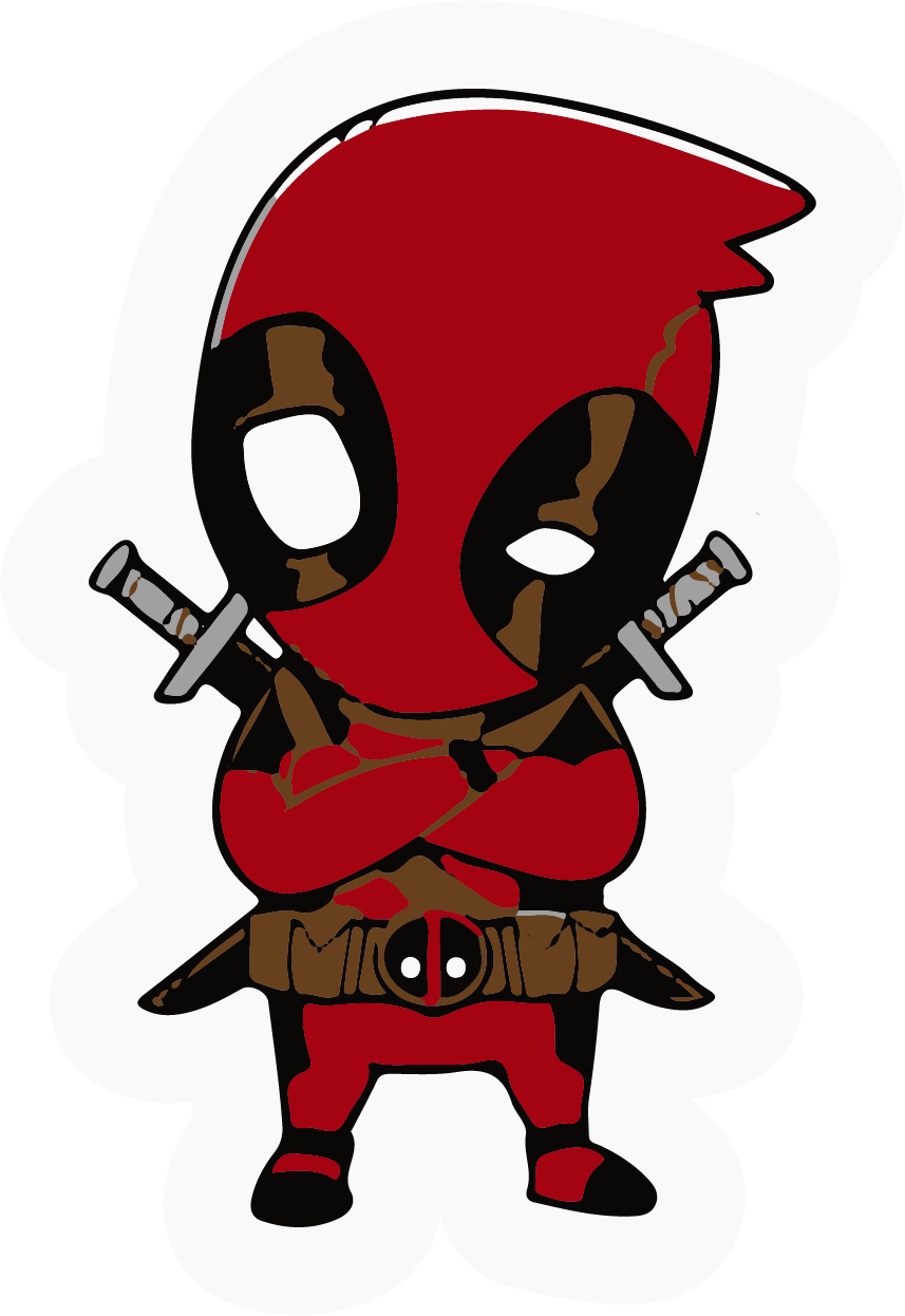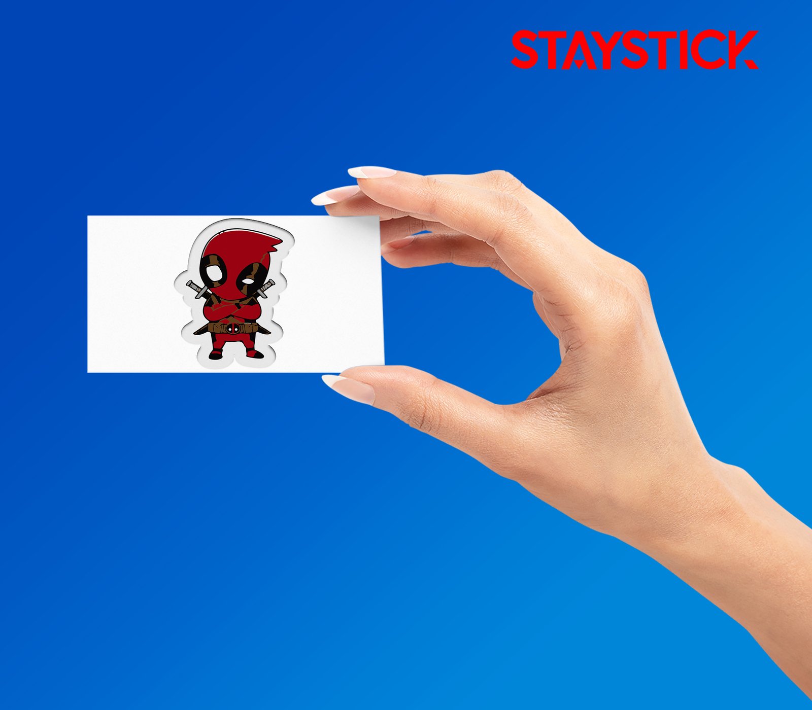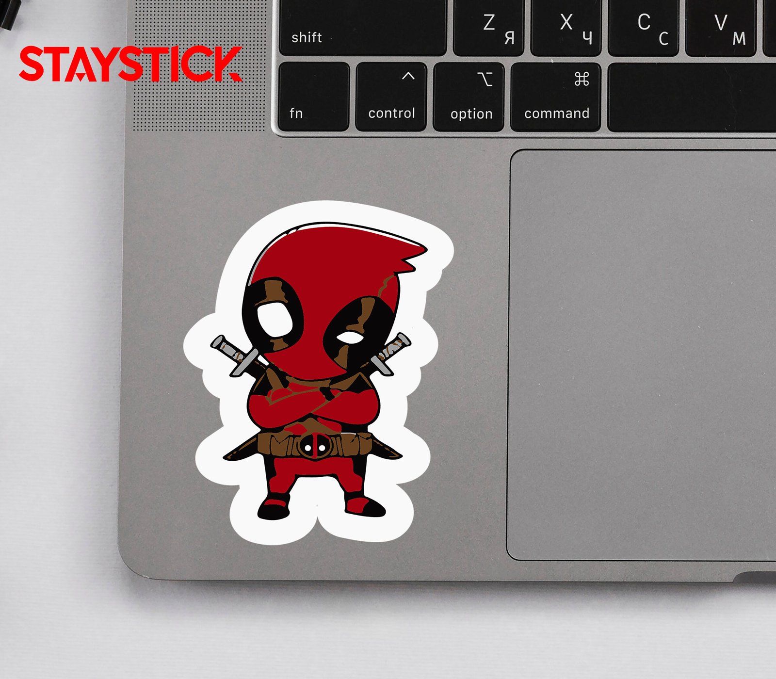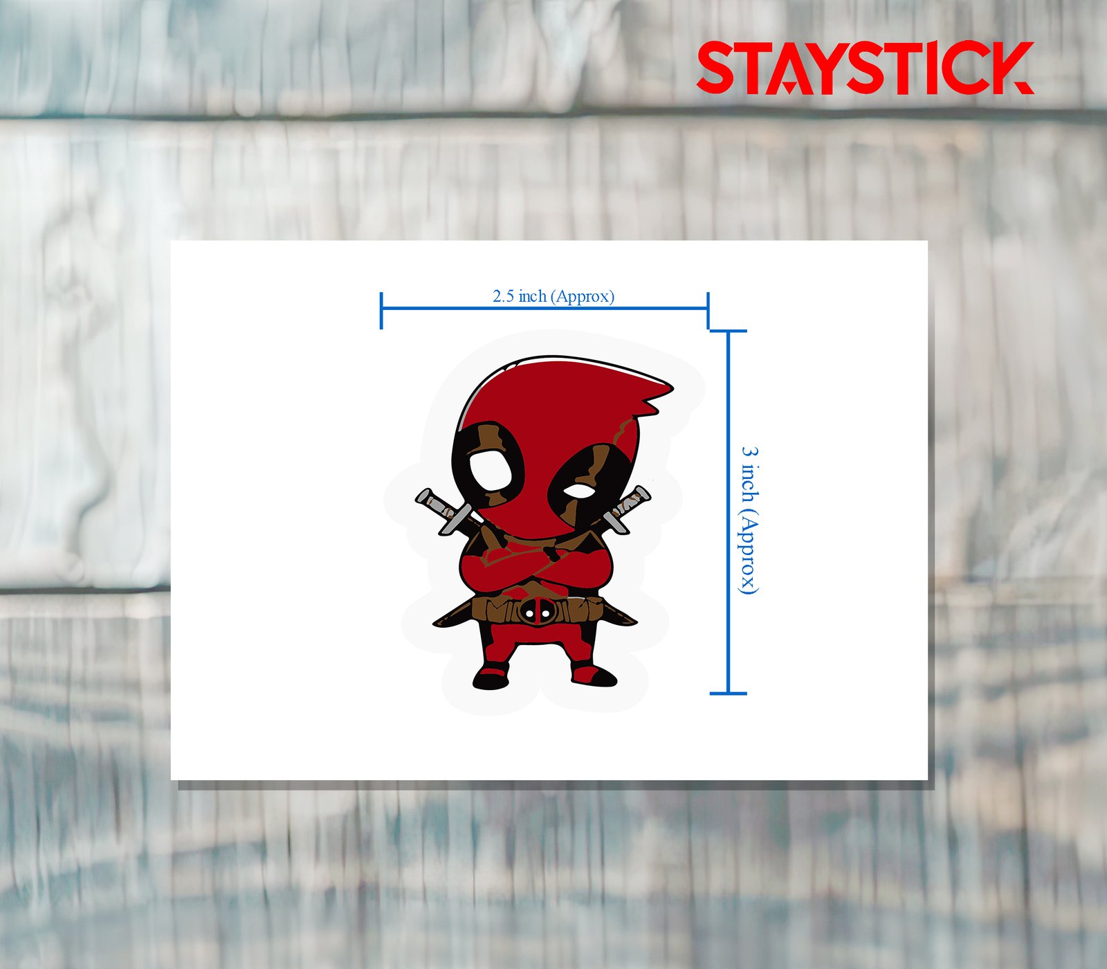This sticker captures a playful chibi-style rendition of a fan-favorite anti-hero known for his humor, wit, and unfiltered personality. Dressed in his iconic red-and-black suit with large white eye patches on the mask, he stands with arms crossed, radiating attitude and mischief. The twin swords on his back highlight his combat-ready side, while the exaggerated chibi proportions add a touch of cuteness to his otherwise fierce persona. The detailed belt, complete with his signature logo, enhances the overall design. Perfect for fans who love characters that combine action, comedy, and a rebellious spirit, this sticker adds both charm and boldness to any collection.