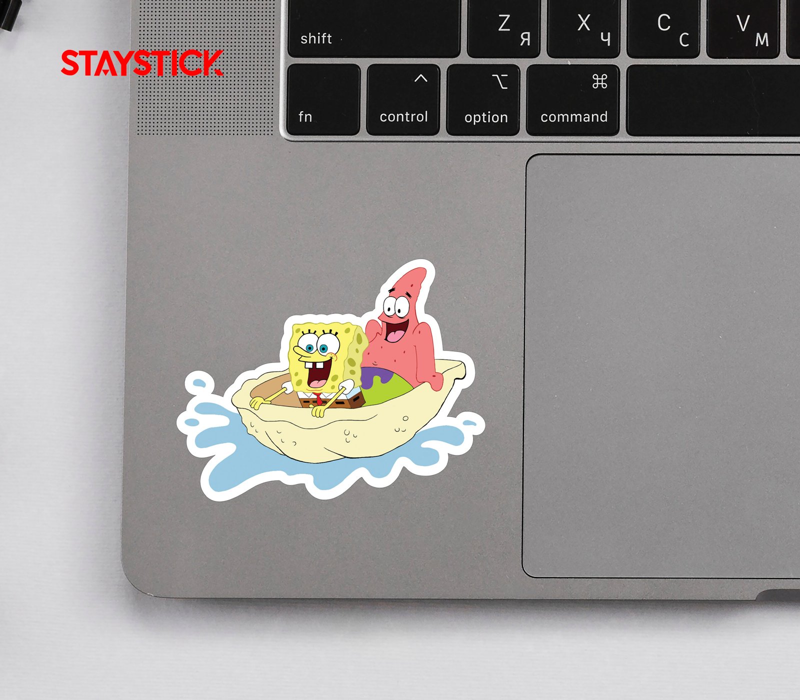 Fun sticker featuring Spongebob and Patrick riding a clam boat. Great for fans!