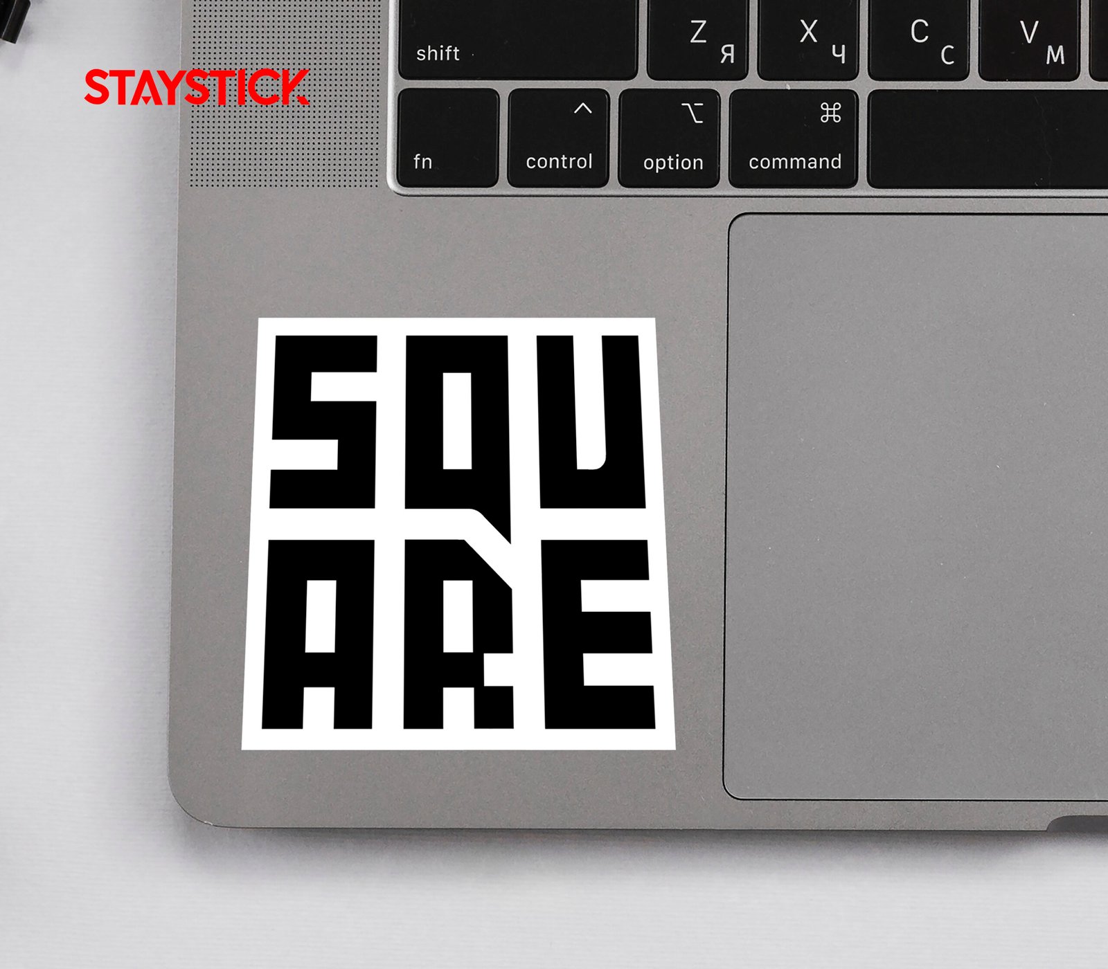 Clean, modern sticker that arranges the word “SQUARE” into a 3×2 grid of chunky, rectilinear letterforms. The letters are tightly kerned and use negative space as a design device, producing a stamp-like, emblematic mark that reads as both type and abstract pattern.