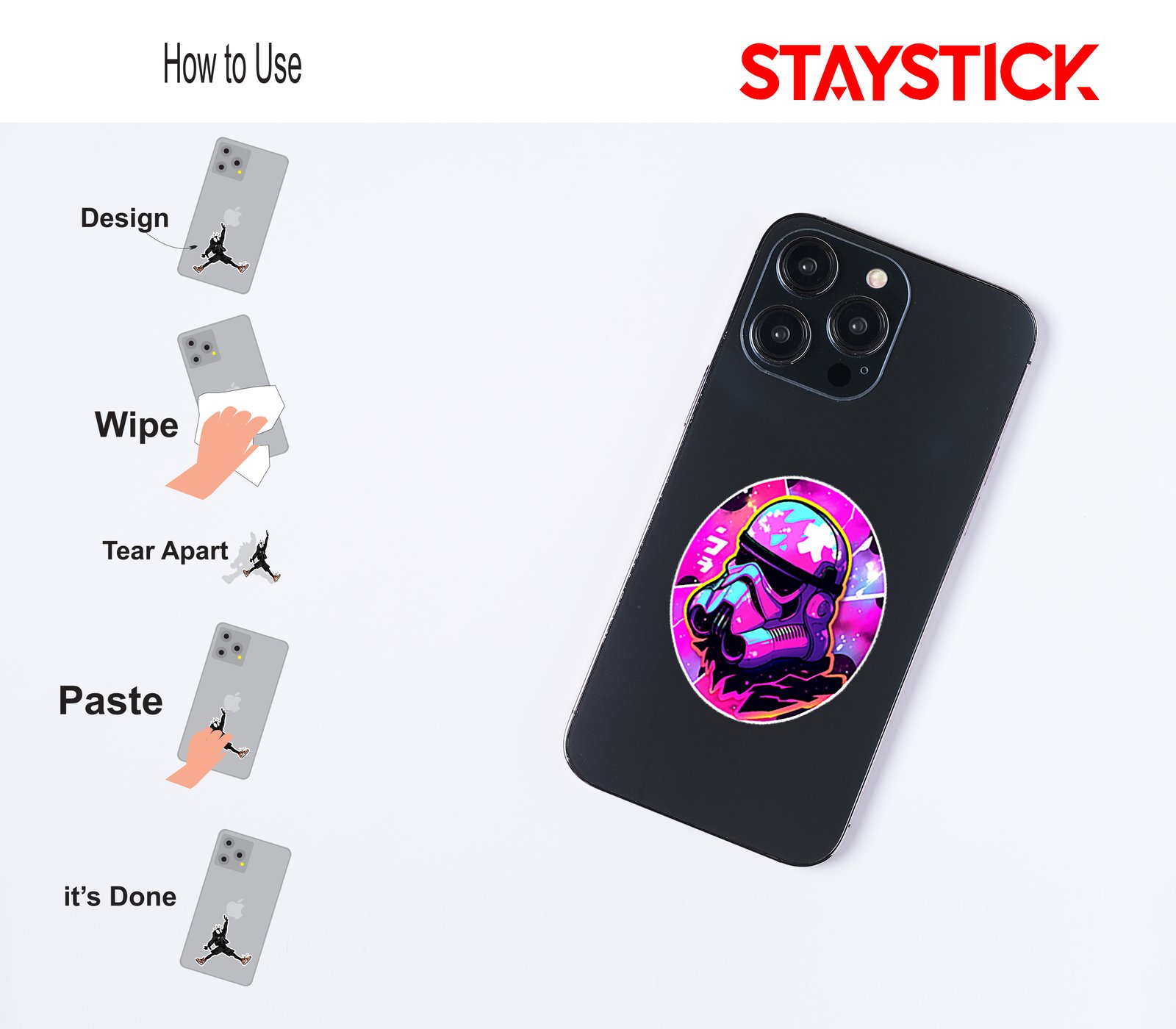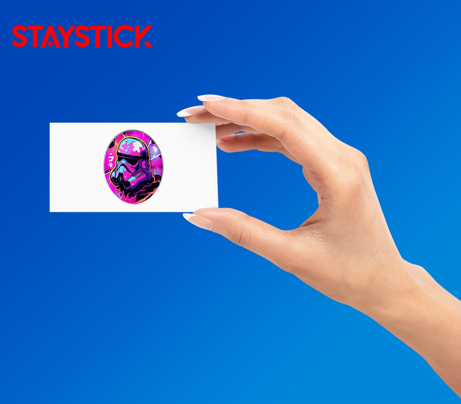 Pop‑art sci‑fi decal combining clean vector lines, dramatic shading, and prismatic color shifts; the black visor and bold outline make it read clearly at small sizes while the holographic finish shimmers when tilted.