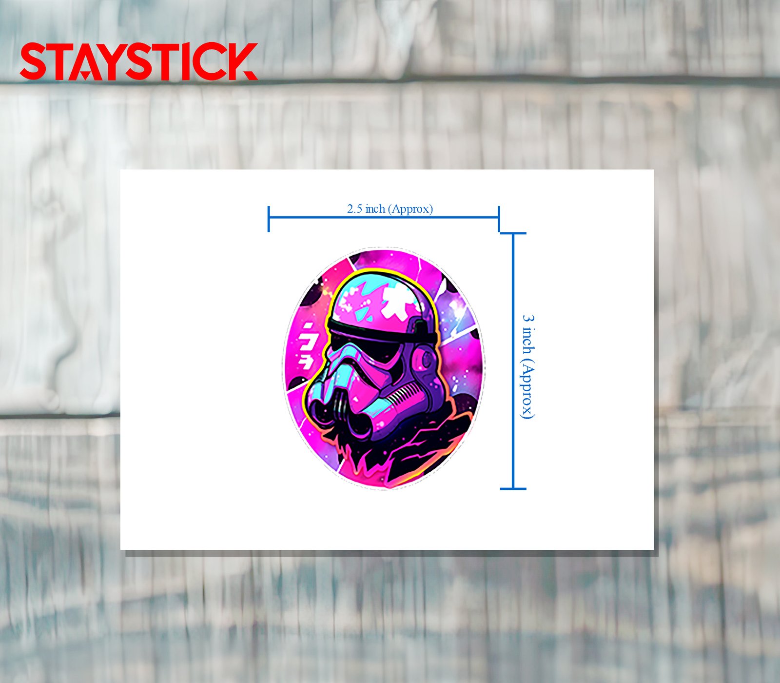 Iridescent holographic sticker of a stylized stormtrooper helmet rendered in vivid magenta, cyan, and neon yellow highlights; glossy speckles and paint splatters give it a retro‑futuristic, vaporwave vibe perfect for laptops and skate decks.