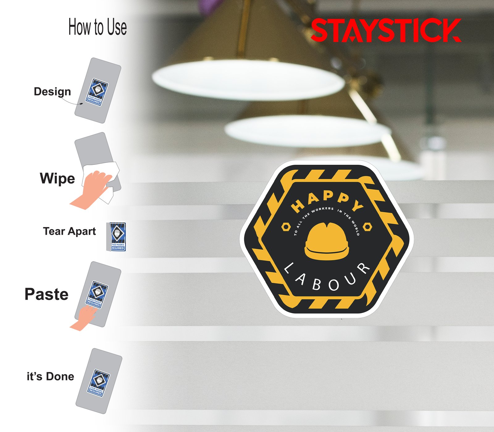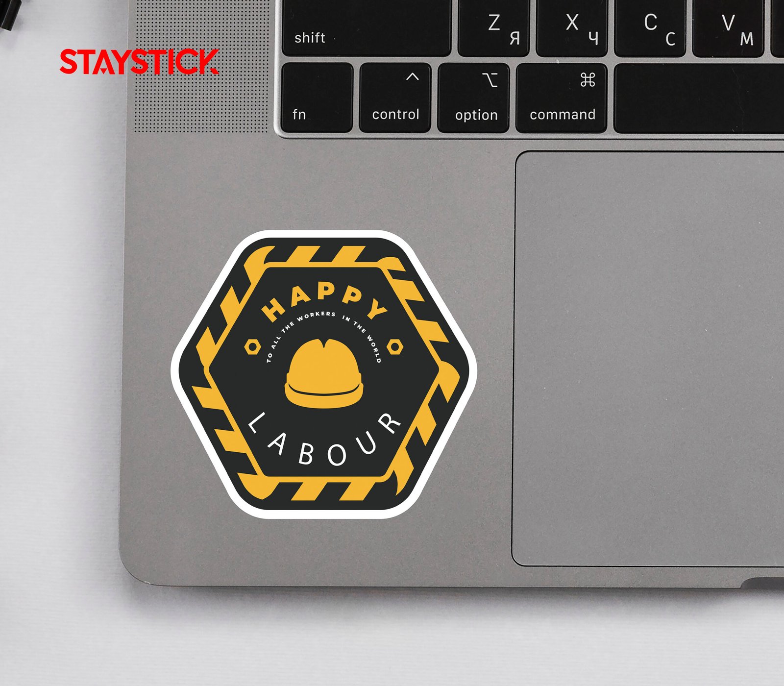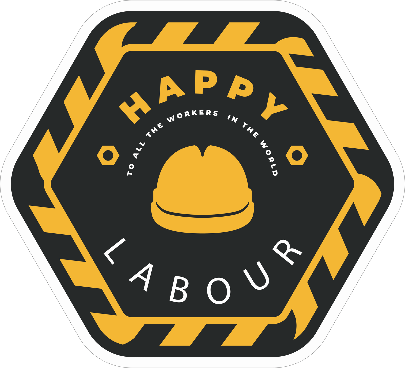 “Stylish Labour Day sticker with a hard hat design, bold yellow-black theme, and the message Happy Labour honoring workers worldwide.”