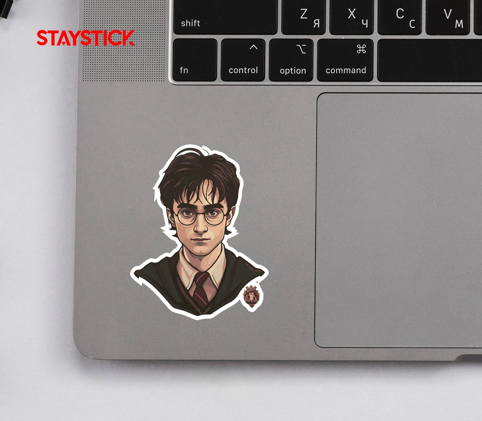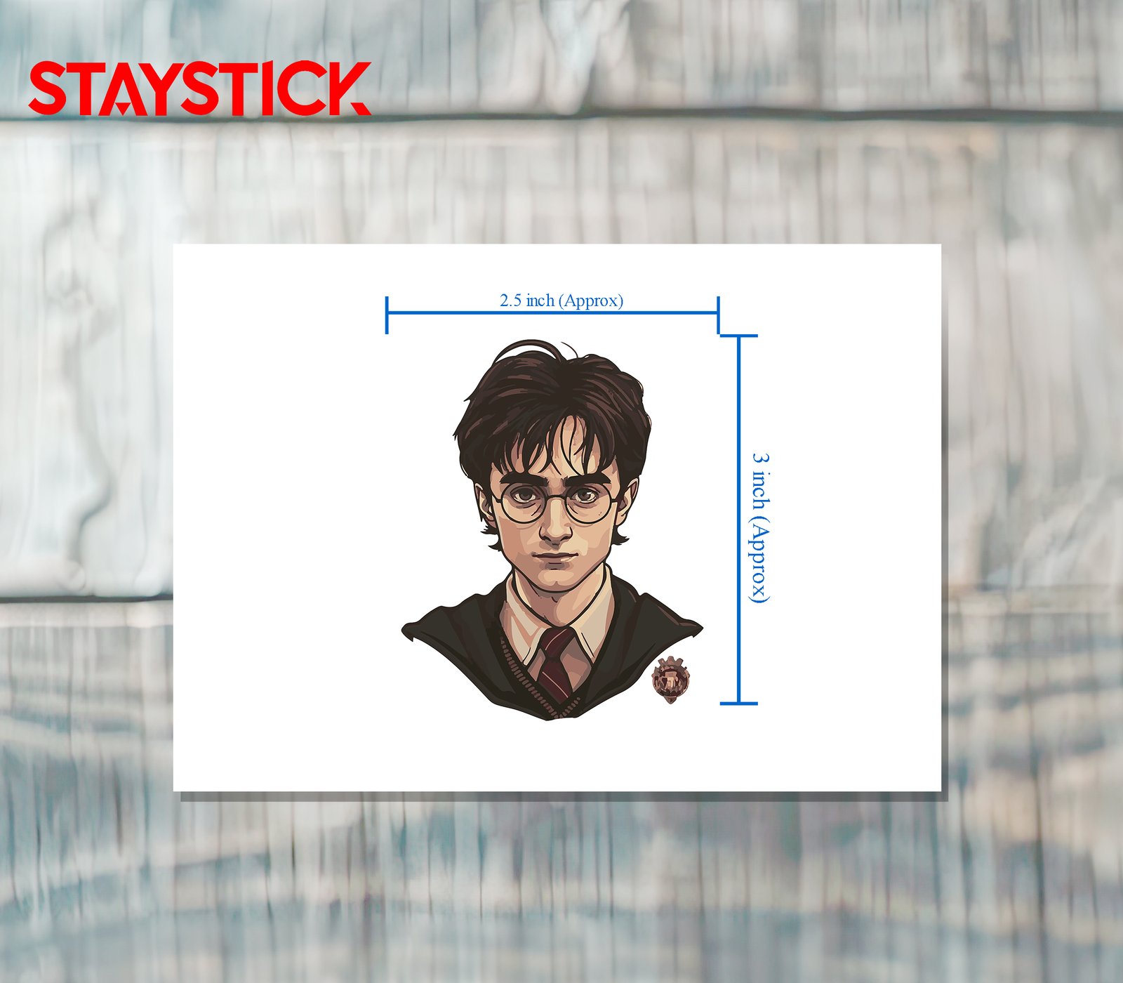 Detailed sticker portrait of a young wizardly student: round spectacles, tousled dark brown hair, and a focused, determined expression. He wears a collared shirt, striped tie, knitted sweater, and dark robe; shading uses warm, painterly strokes and a soft white sticker outline with a small school crest at the corner.