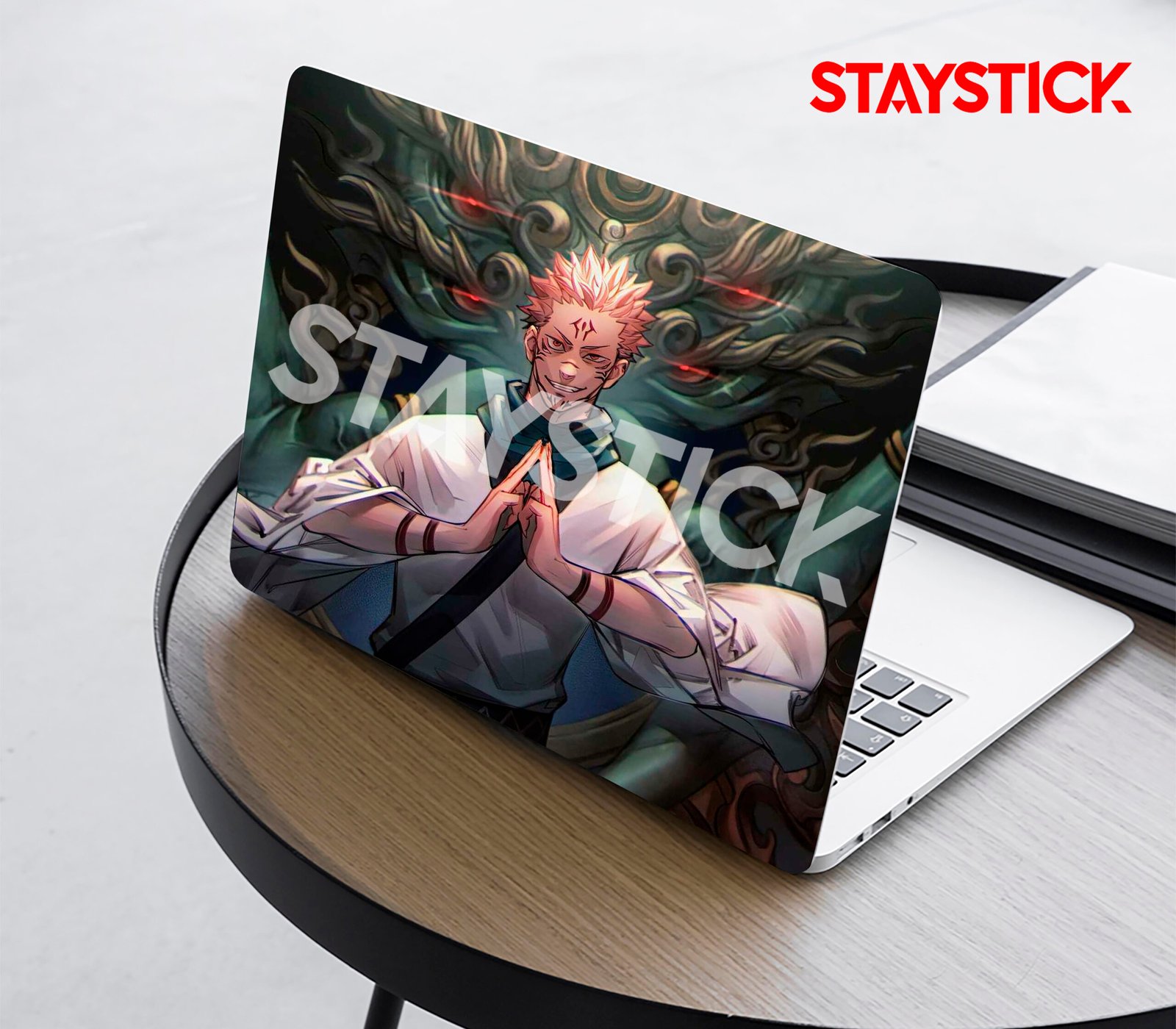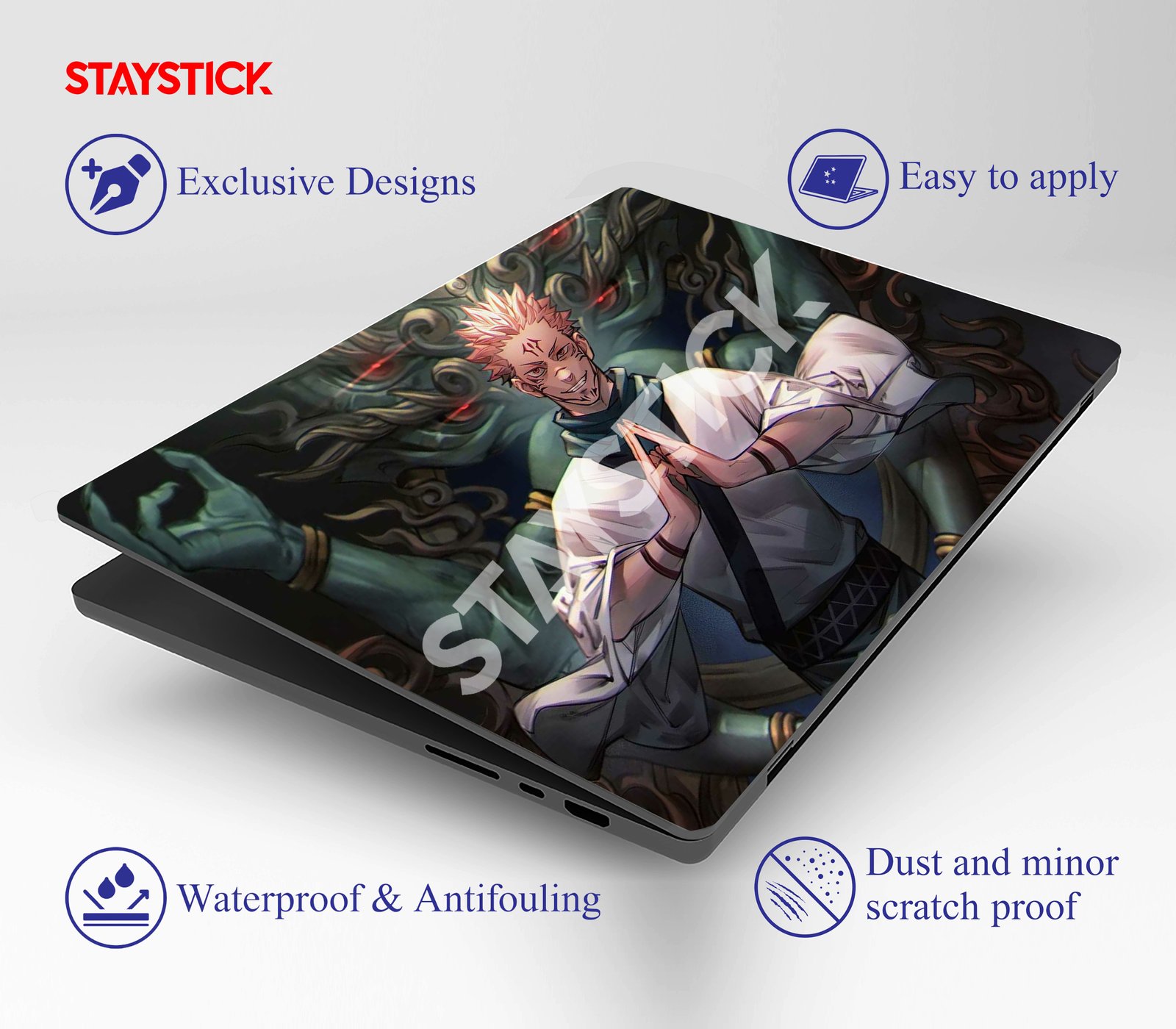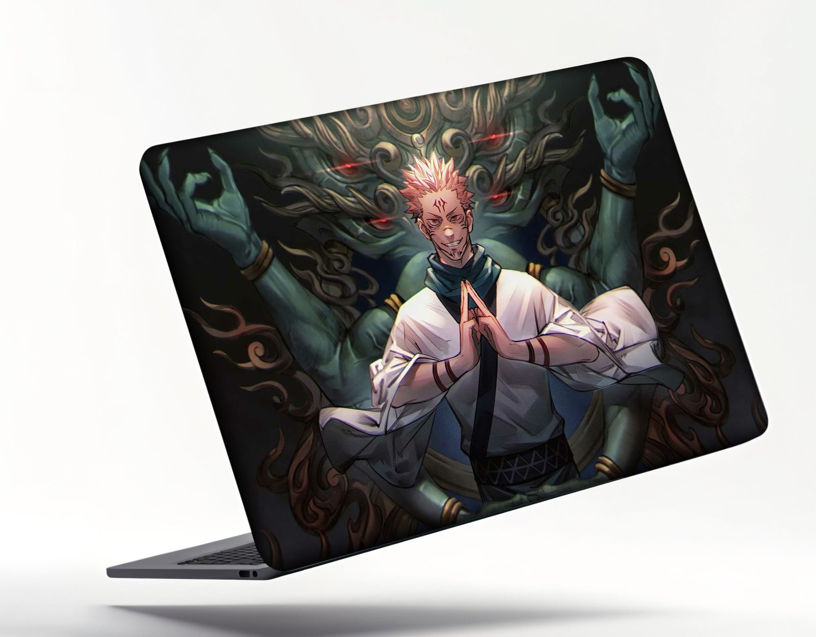 This laptop sticker skin showcases a dramatic anime design of a commanding character with intense expression and symbolic markings, backed by a dark, supernatural figure with glowing eyes. The intricate details, vibrant colors, and strong contrasts make it a standout piece for anime enthusiasts who want to personalize their device. Crafted from premium vinyl, the skin not only elevates the appearance of your laptop but also provides scratch and dust protection. Easy to apply and residue-free on removal, it’s ideal for students, gamers, or collectors who want their laptop to reflect their passion for anime and powerful artistry.