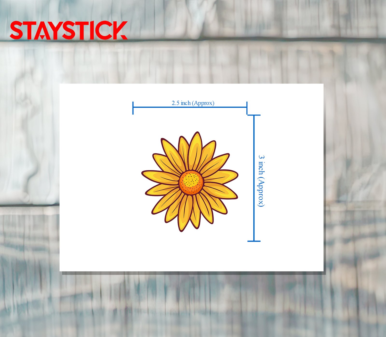 Cheerful sunflower illustration with multiple overlapping yellow petals, a speckled orange disc, and a thick white cutline for strong silhouette and easy peel. Clean linework, subtle shading, and saturated colors ensure legibility at small sizes and a sunny, friendly vibe perfect for stationery, water bottles, or kids’ decor.