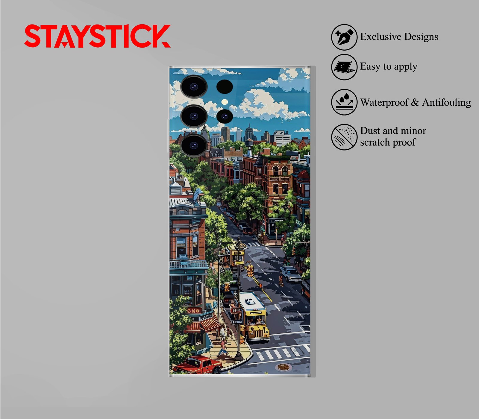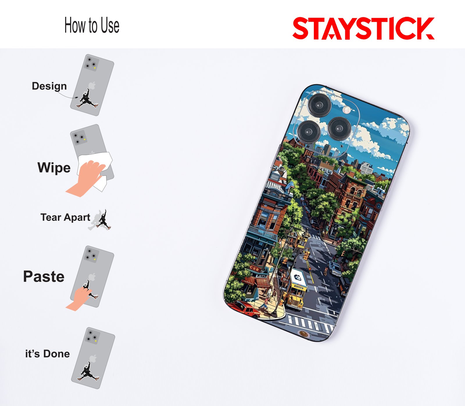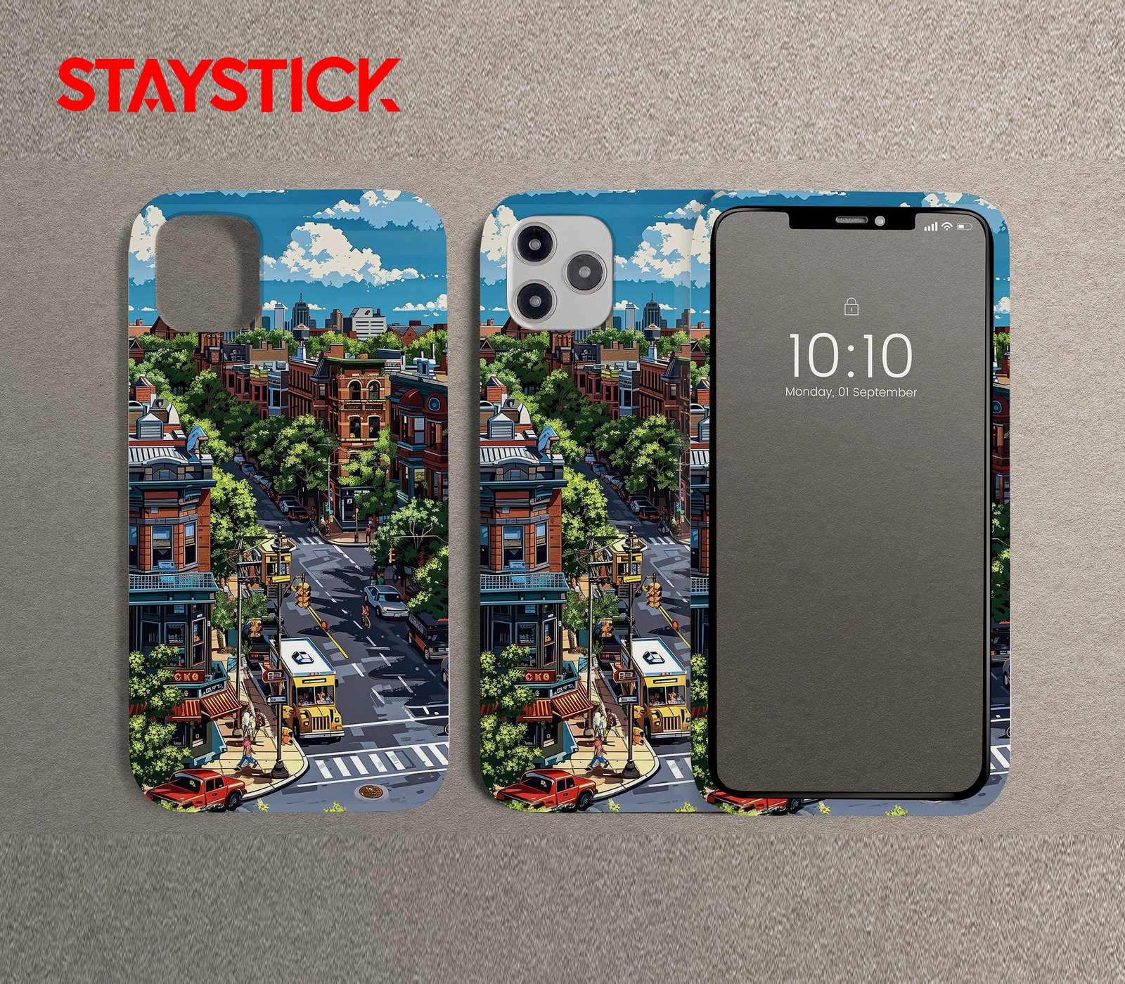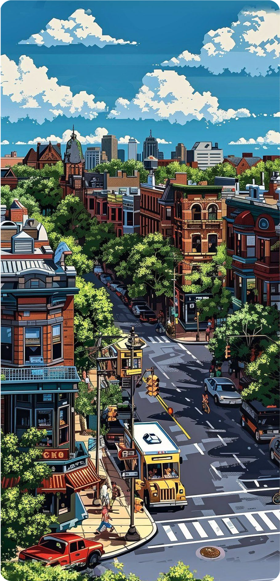 A richly illustrated mobile sticker showing a bustling urban neighborhood seen from above: tree-lined streets, red-brick rowhouses, pedestrians, cars, and a bright yellow trolley navigating an intersection. Clear graphic linework, saturated colors, and patterned shadows create depth while remaining legible on small screens.