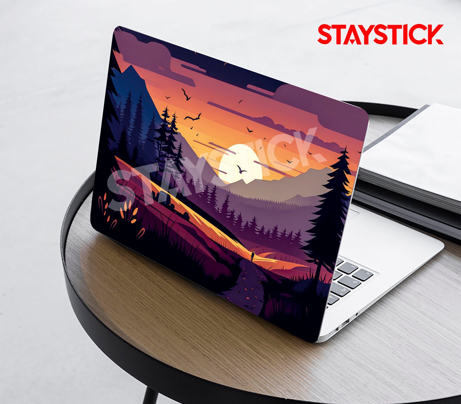 A laptop with a vibrant sunset-themed skin featuring mountains, trees, and birds, placed outdoors on a rock with the real sunset in the background.