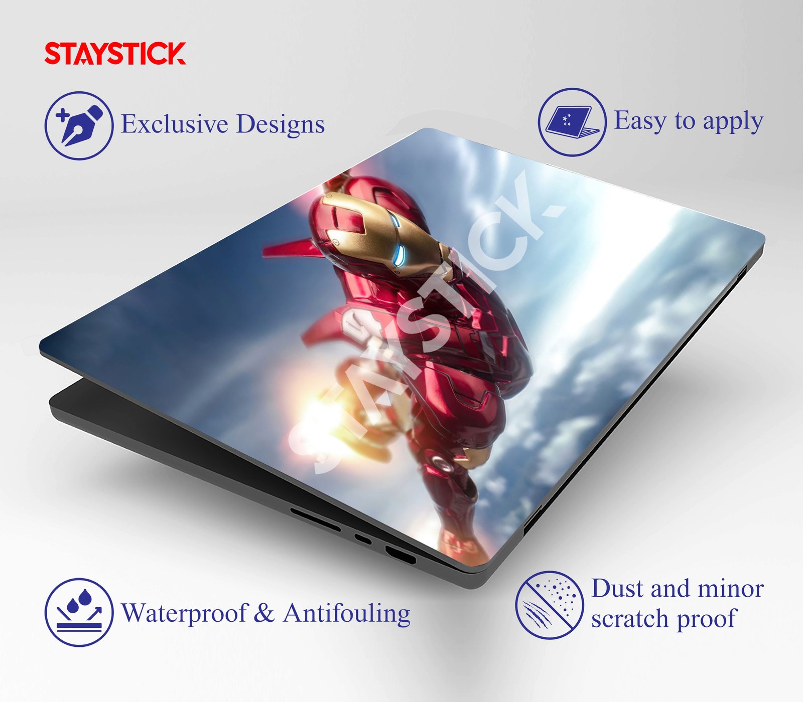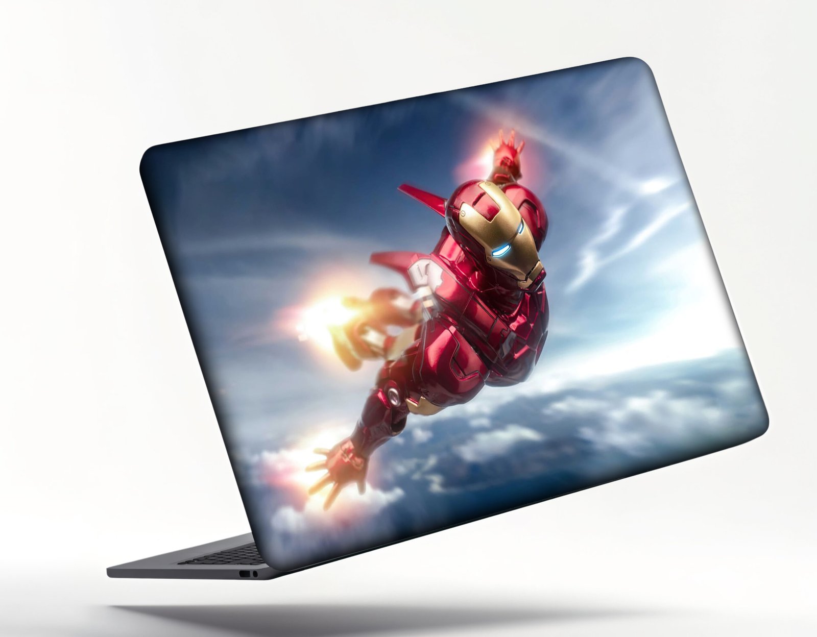 Stylish laptop skin featuring a high-definition superhero in flight, combining bold red and gold armor with a futuristic sky backdrop for a dynamic and powerful look.