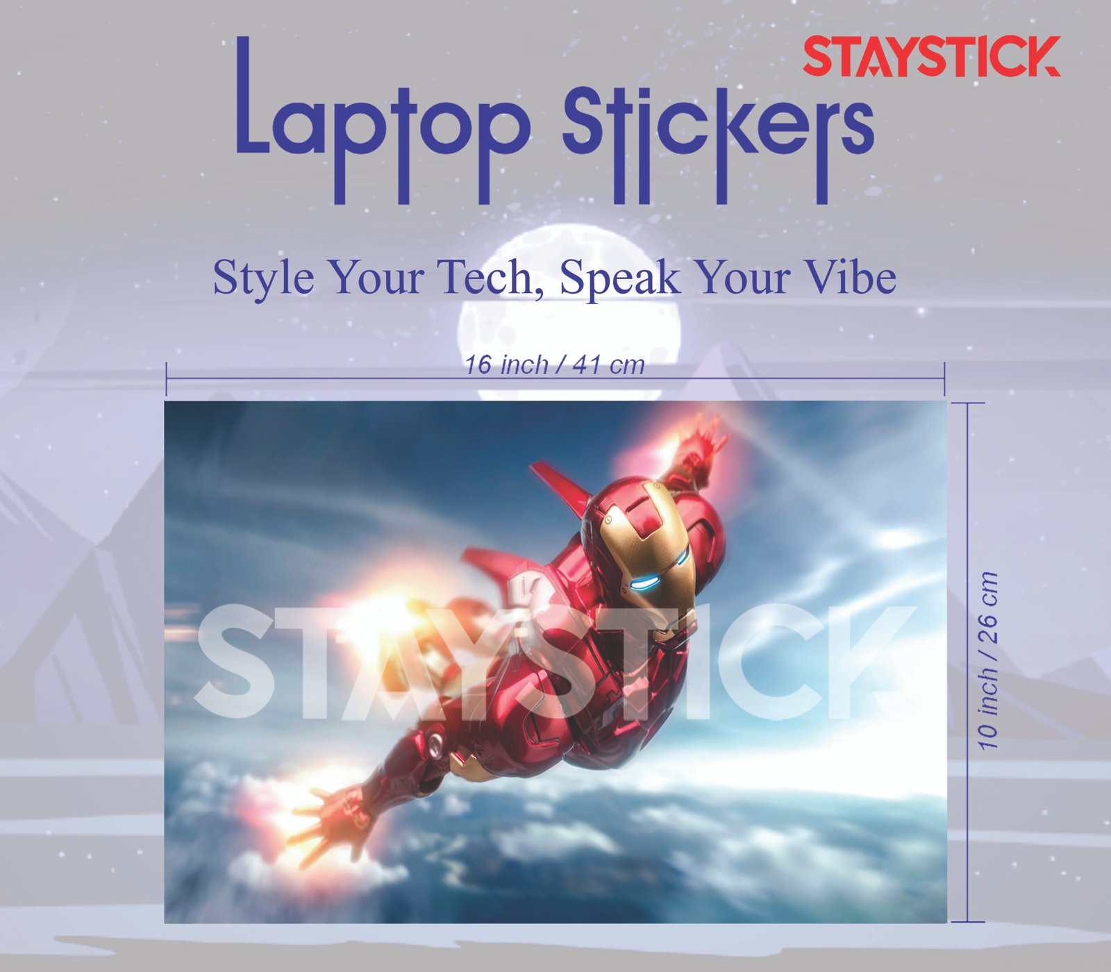 This laptop sticker showcases a striking design of a legendary armored superhero soaring through the sky, with glowing blue eyes and jet-powered flight effects. The vivid red and gold suit contrasts beautifully against the soft, cloudy background, creating a dramatic and action-packed aesthetic. Perfect for fans of superhero culture, this skin not only personalizes your laptop but also provides durable protection against scratches, dust, and daily wear. Made from high-quality vinyl with a smooth finish, it’s easy to apply and remove without leaving residue. Whether you’re a student, gamer, or professional, this sticker transforms your device into a bold statement piece that reflects strength, innovation, and energy.