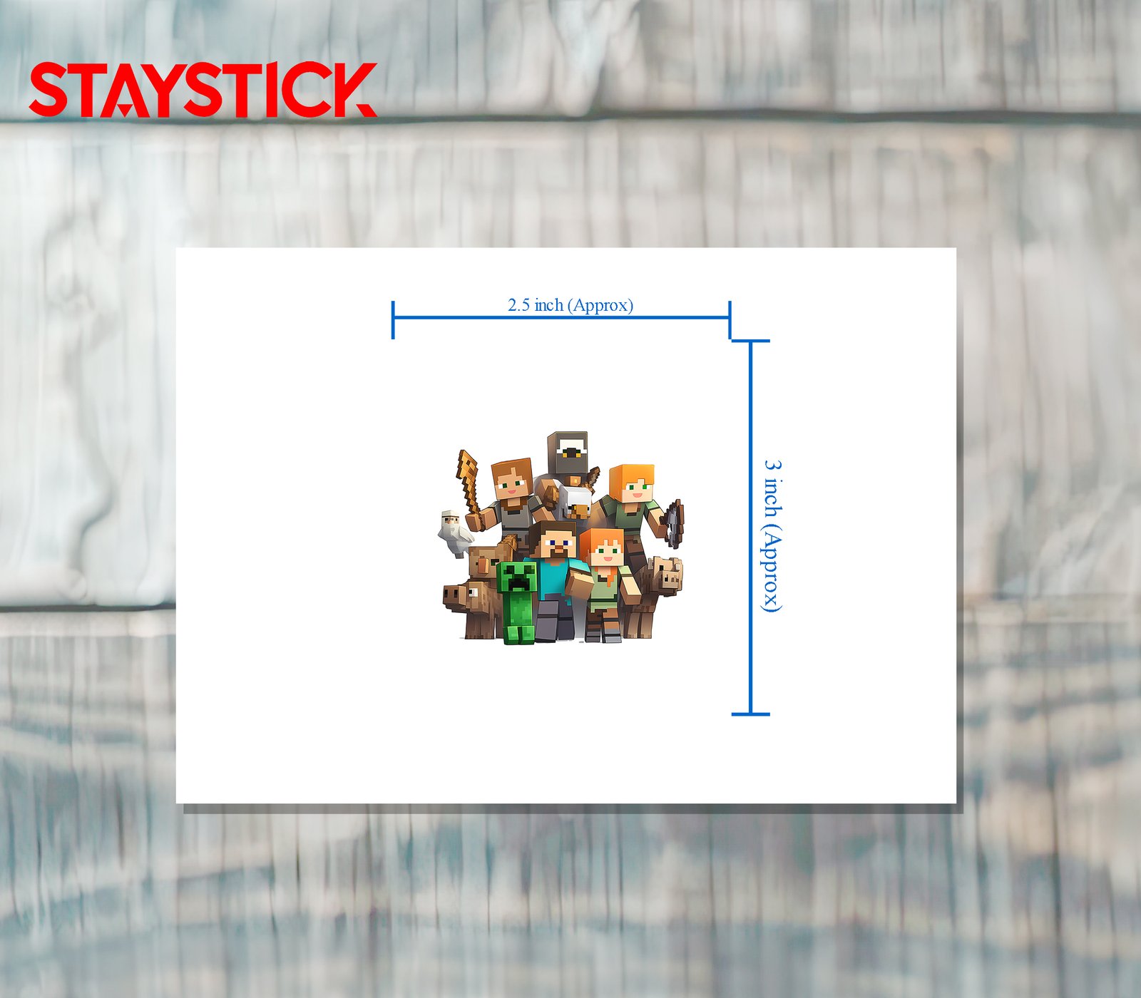 Minecraft sticker featuring Steve, Alex, a Creeper, and various mobs. Perfect for gamers!