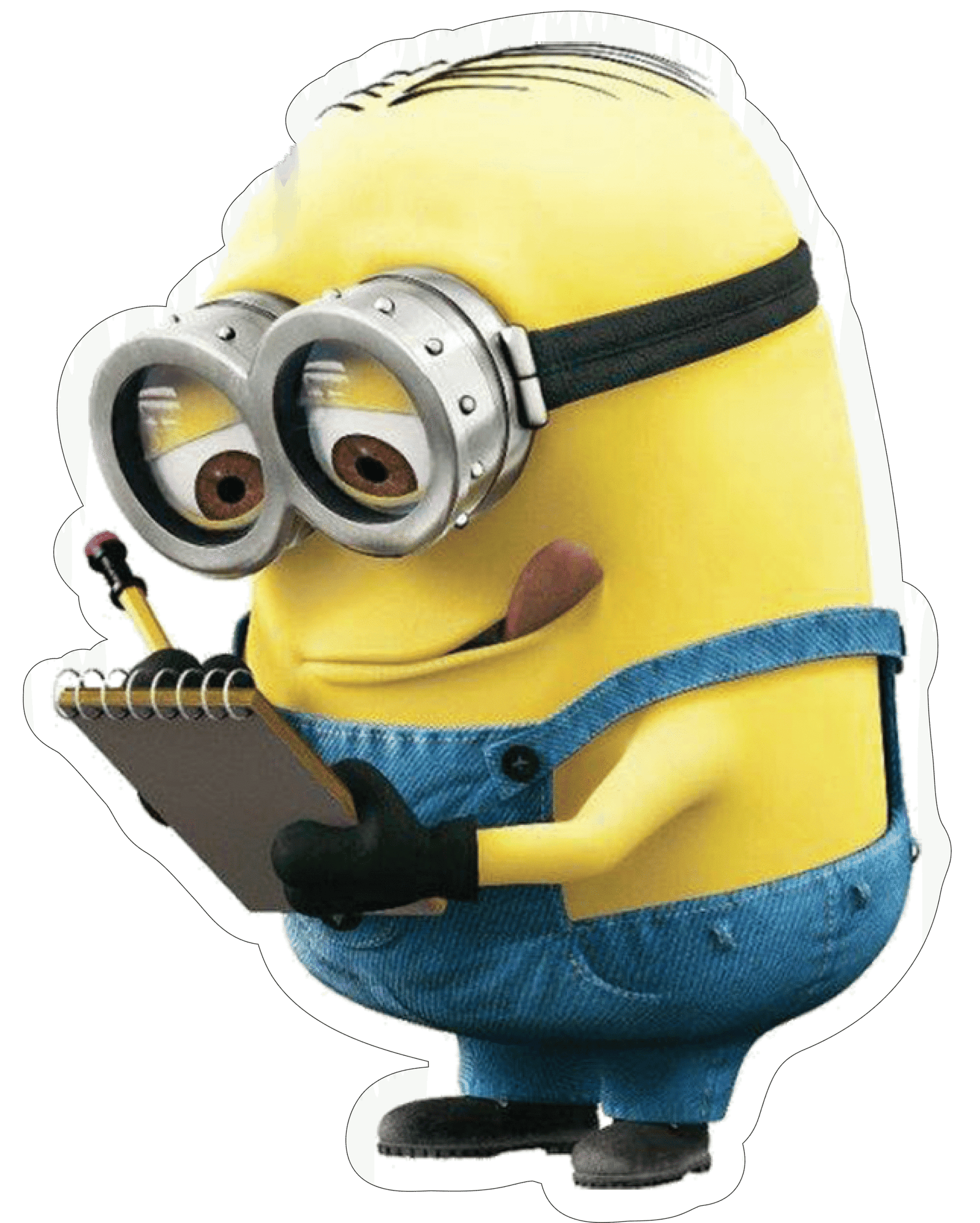 Cute Minion sticker featuring a character with a notepad and pencil, deep in thought.