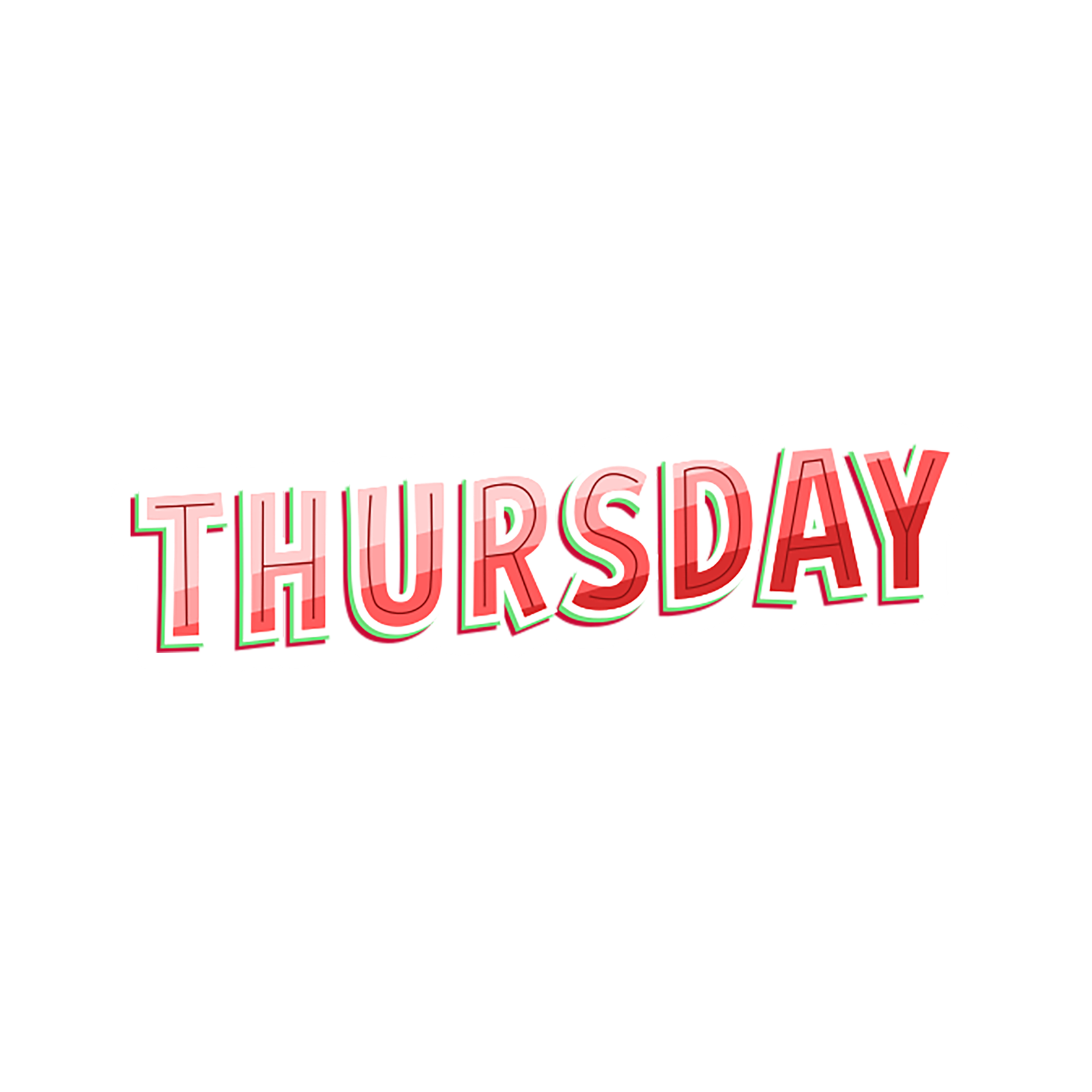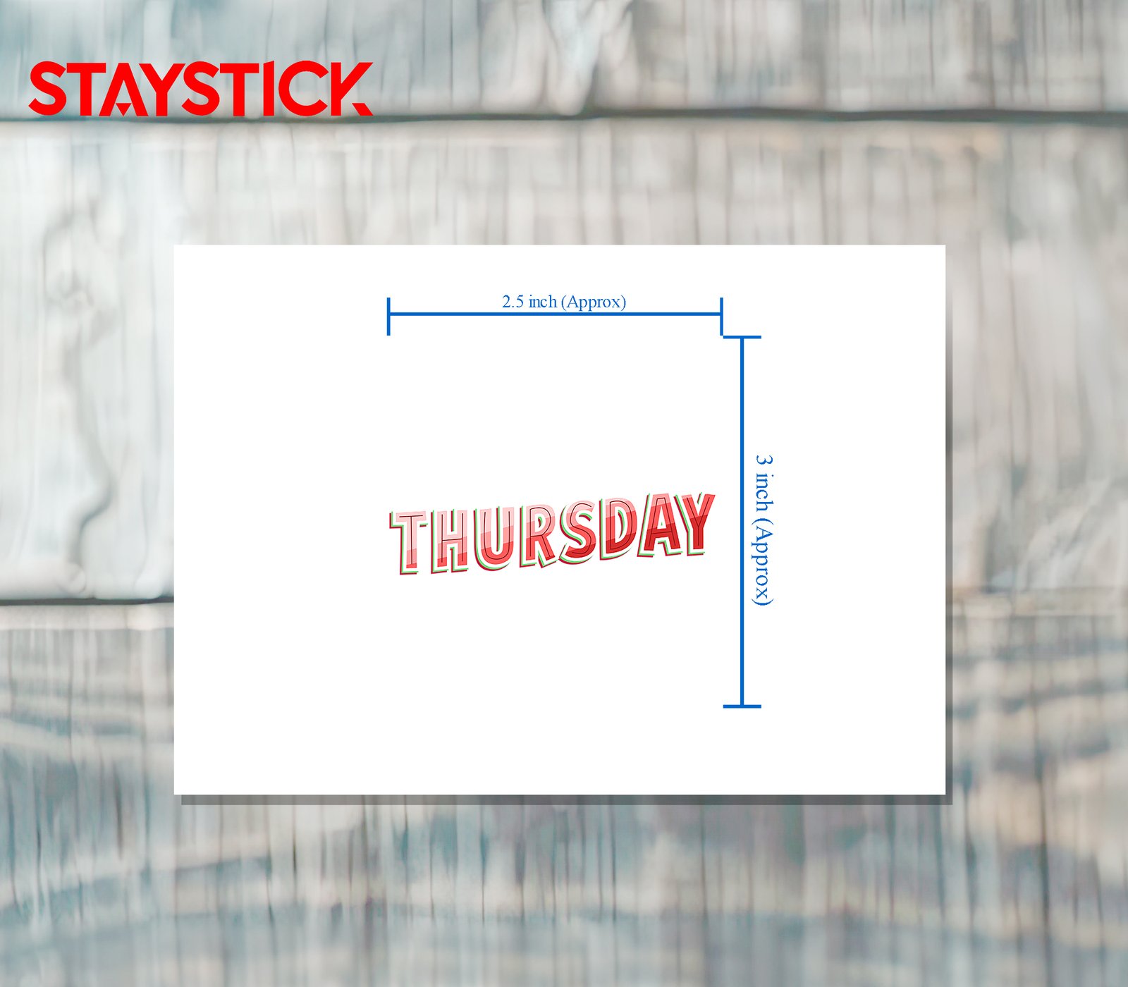 A vibrant, retro-inspired sticker that spells “THURSDAY” in tall, block letters with layered pink-to-red fills, mint-green inset shadows, and a thick white sticker border. The slight skew and glossy highlights give it a playful, mid-century sign feel that pops on dark or neutral surfaces.
