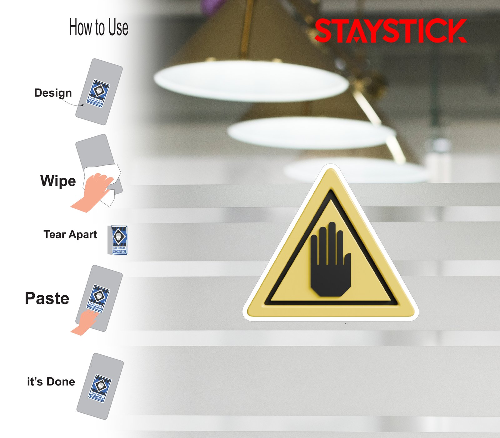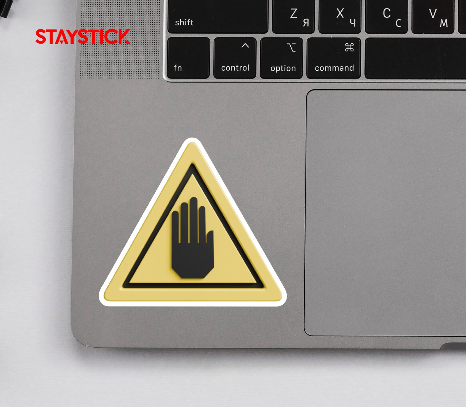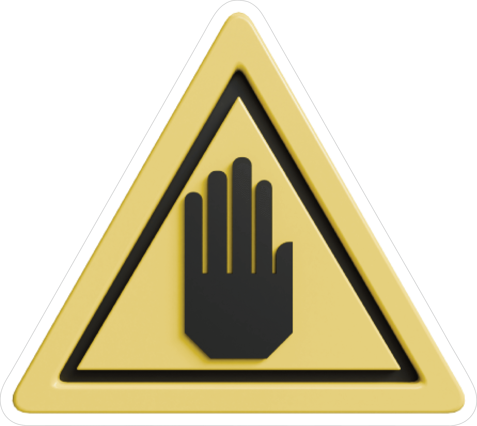“Yellow triangular warning sticker with a raised hand symbol.Caution decal indicating restricted access or stop.Safety warning sign to prevent unauthorized entry.”