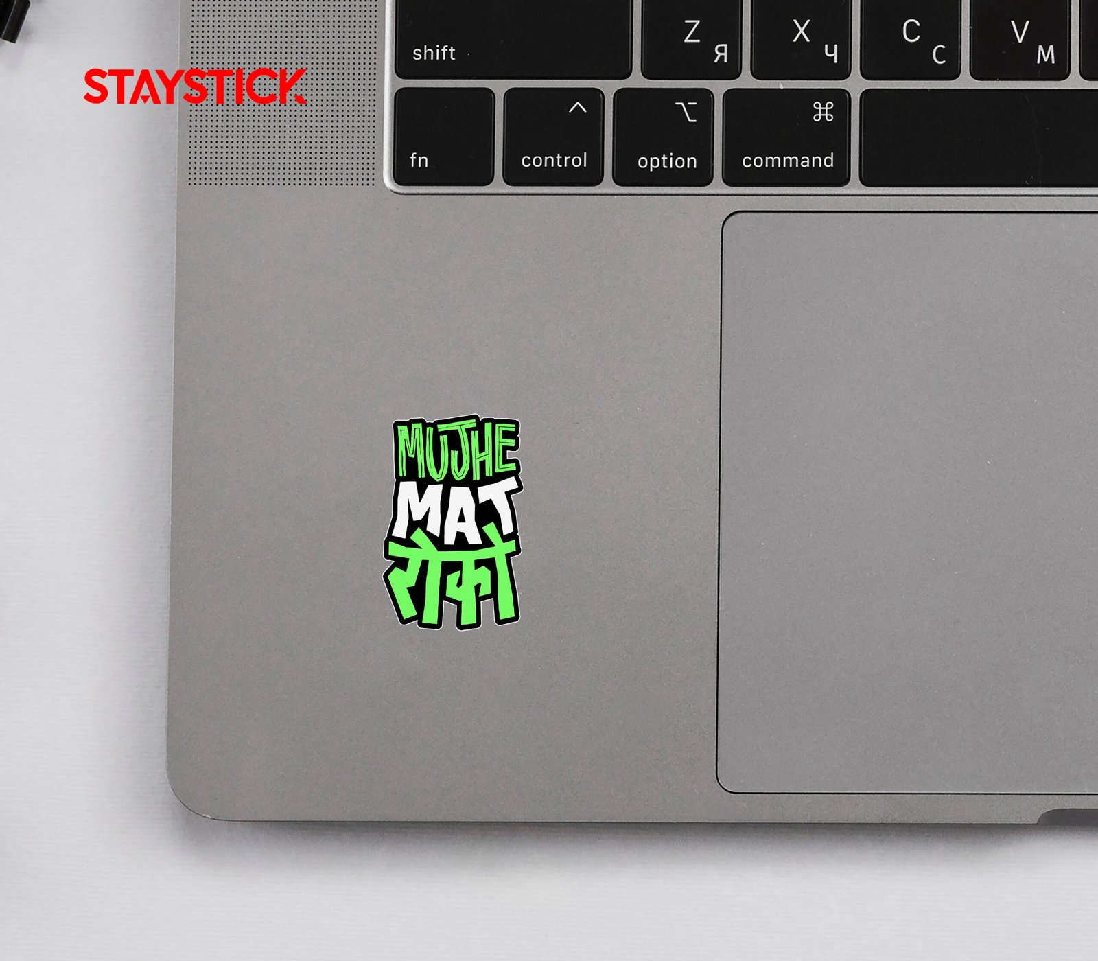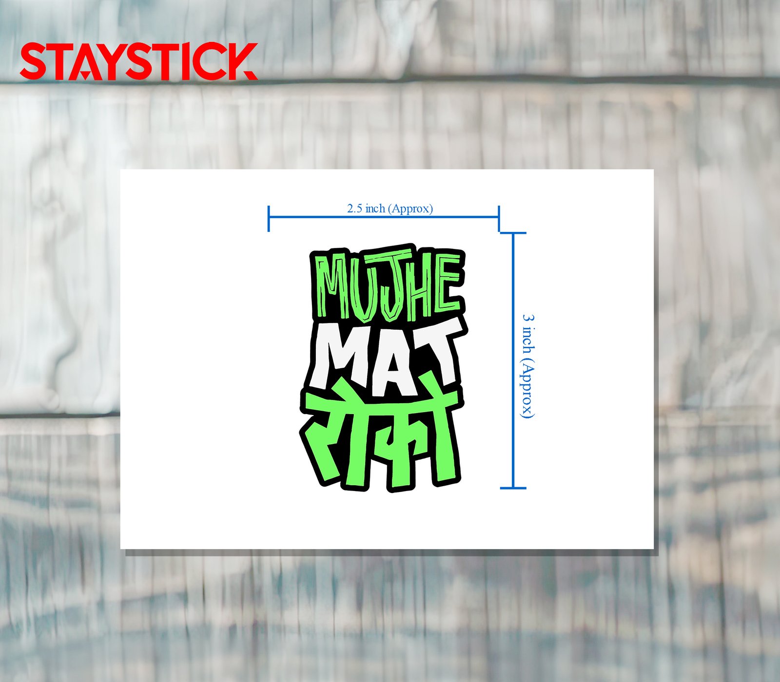 Bold die-cut sticker reading “MUJHE MAT” with matching Devanagari line, neon green and white on black.