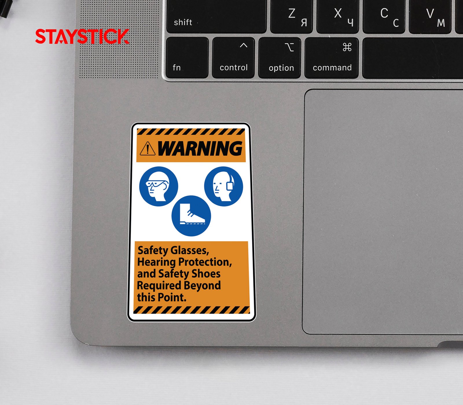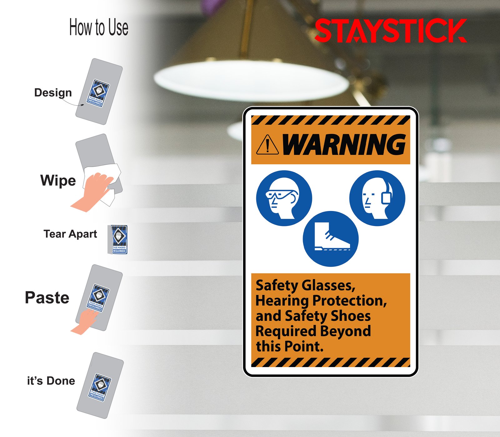 “Warning Sign – Safety Glasses, Hearing Protection, and Safety Shoes Required.Orange warning sticker indicating mandatory PPE beyond this point.”
