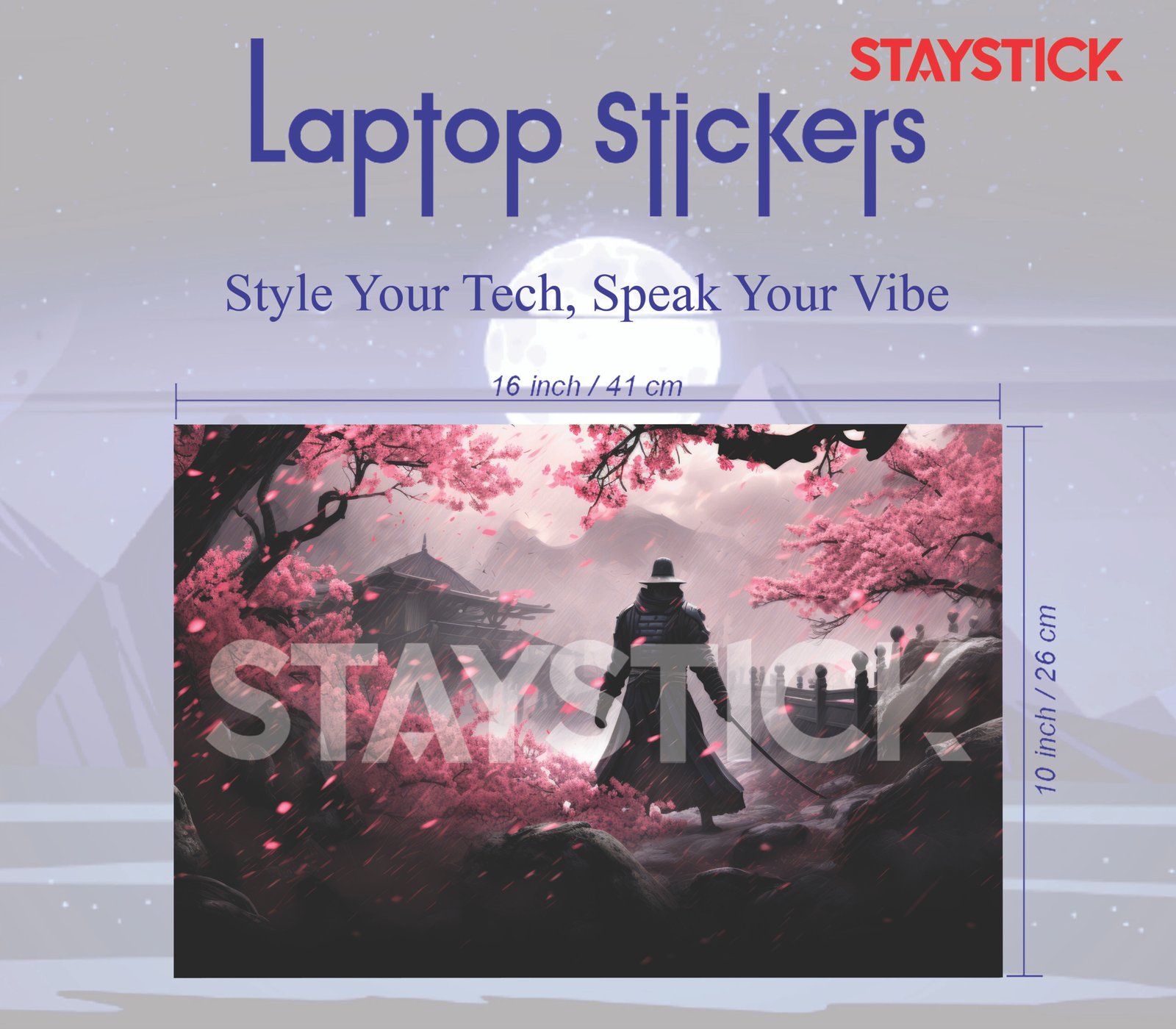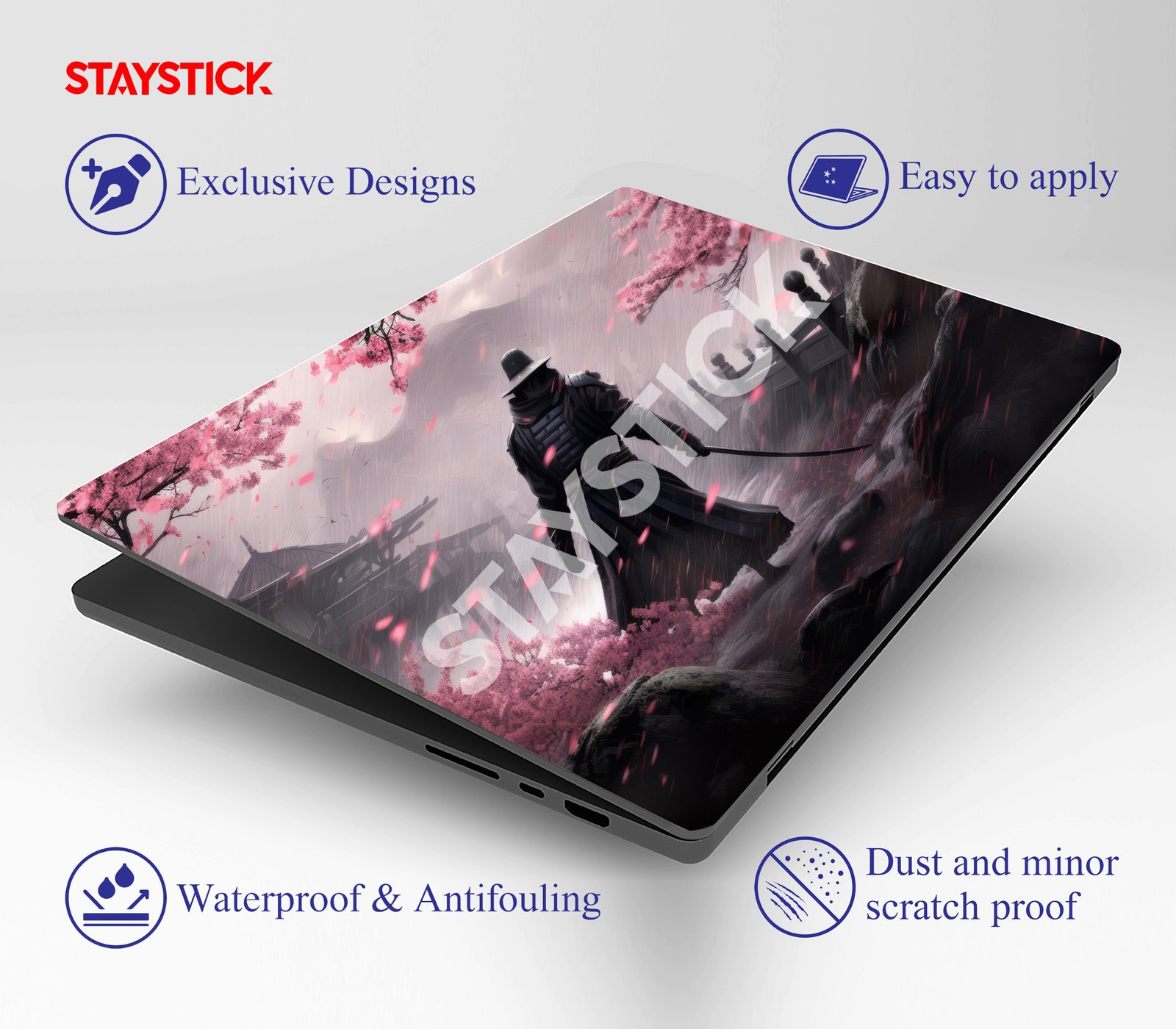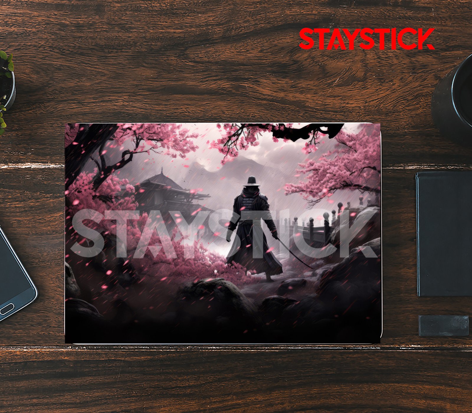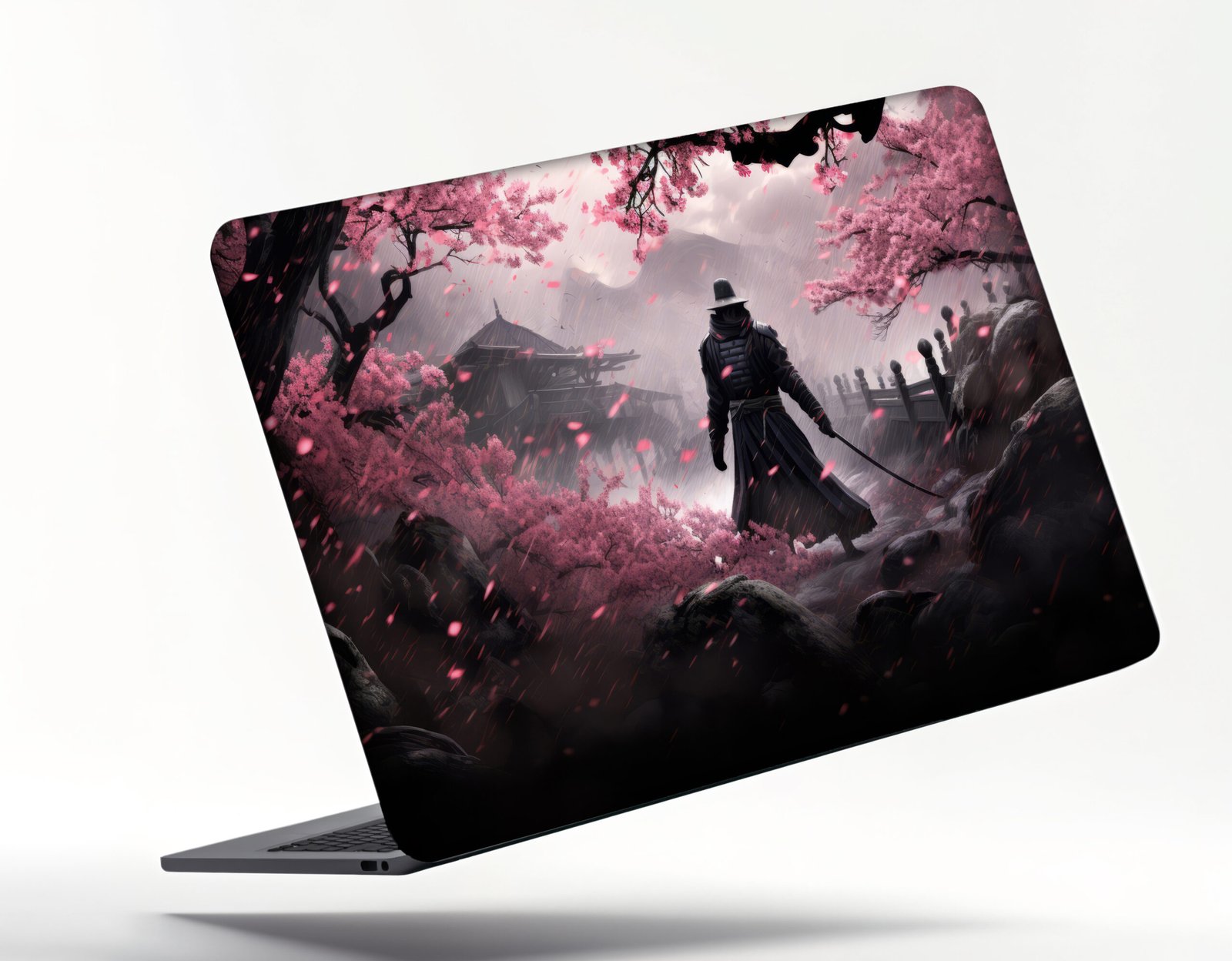 Samurai warrior laptop sticker with cherry blossom design.Elegant Japanese-themed laptop skin.Dark samurai aesthetic with pink sakura backdrop.