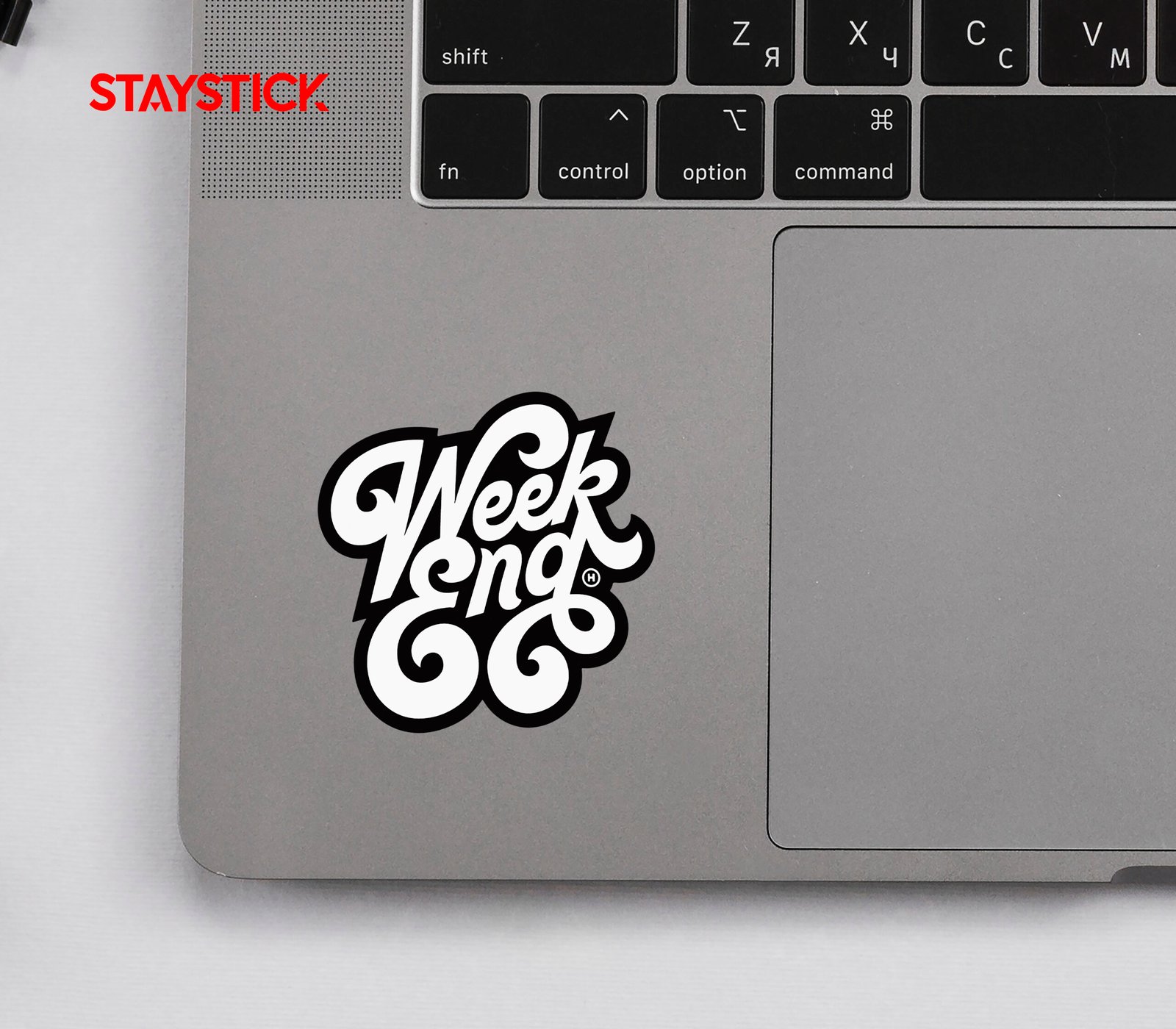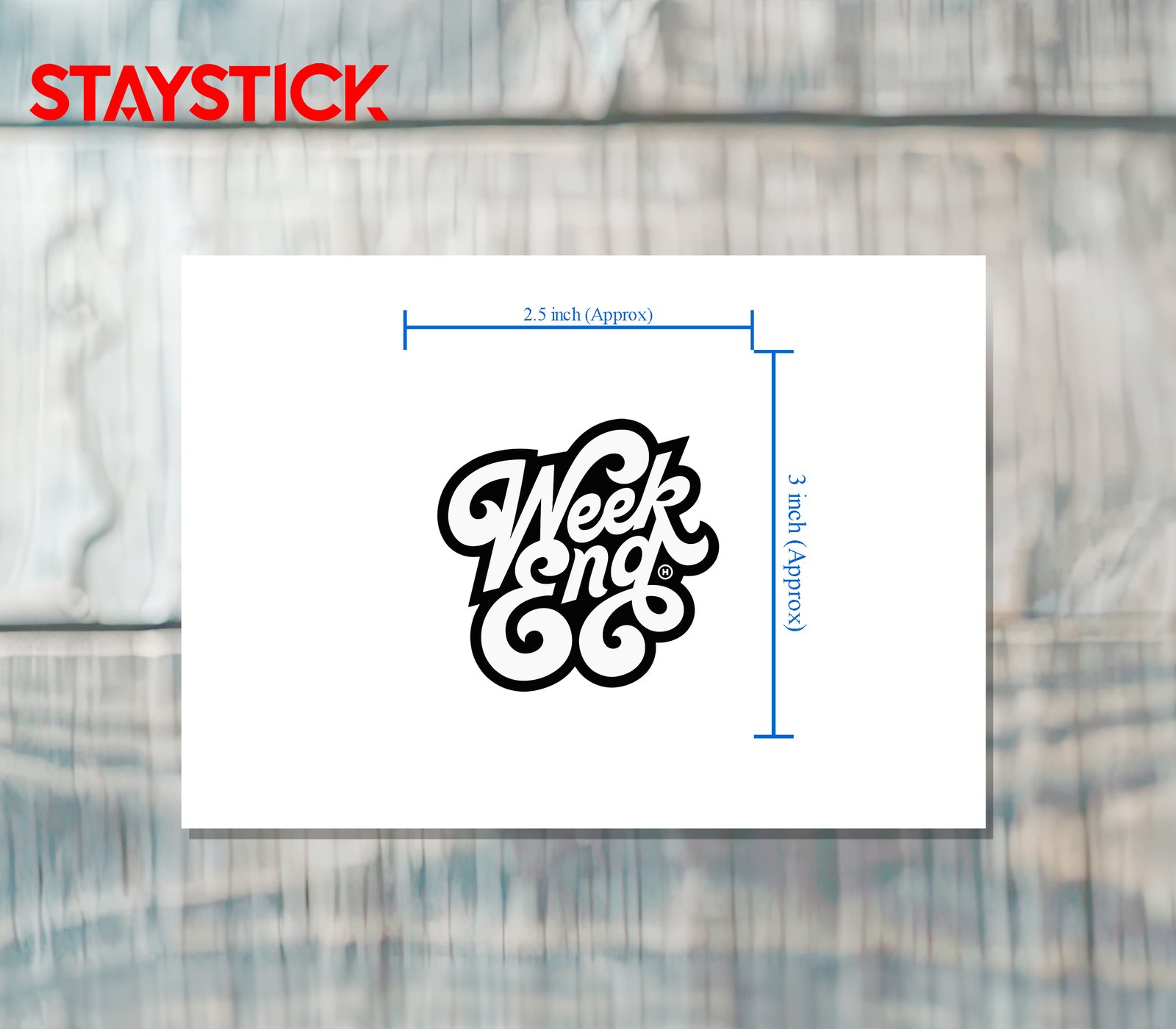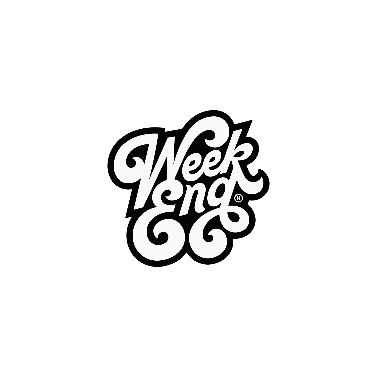 Custom hand-lettered sticker that stacks “Week” over “End” in a vintage-inspired script. Thick, rounded strokes flow into oversized swashes and curled terminals, forming a single cohesive badge silhouette. A subtle black offset/shadow gives depth and a sticker-ready die-cut edge for clear separation on any background.
