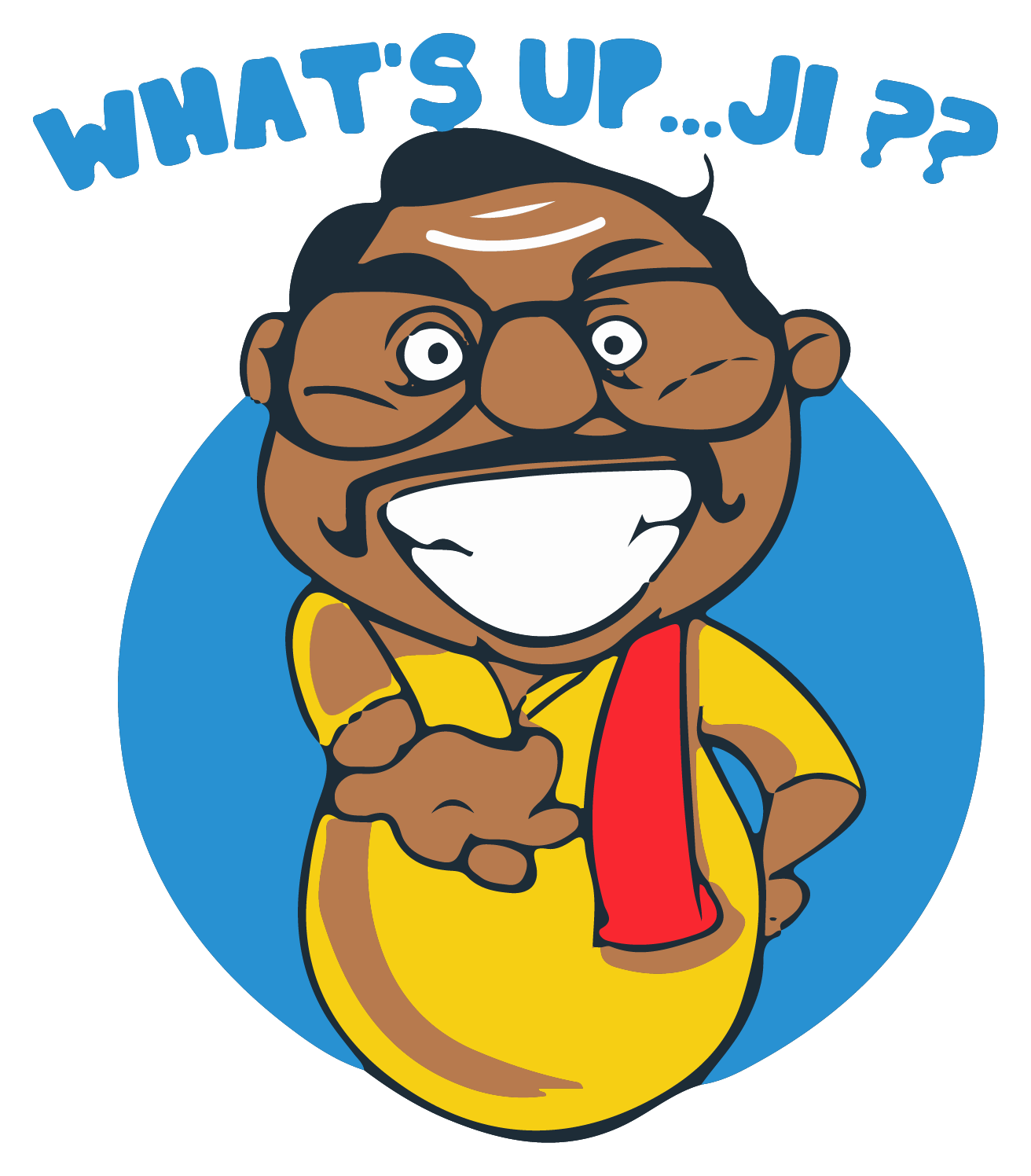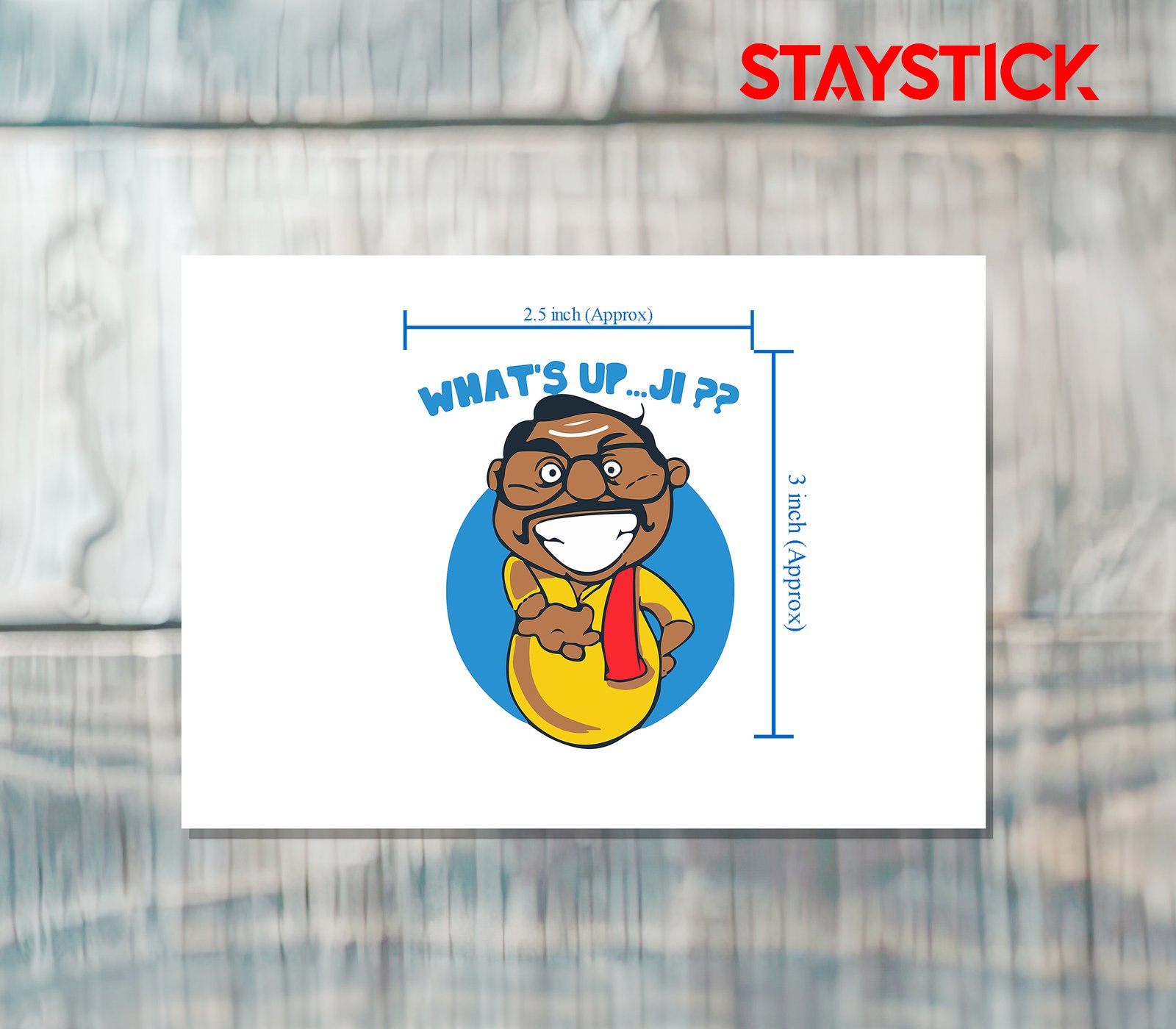 “This lively cartoon sticker features a cheerful man with big glasses, a wide mischievous smile, and an infectious energy. Dressed in a bright yellow outfit with a bold red scarf, he leans forward with one hand reaching out, as if inviting you into his world of fun. His playful expression and the text above saying ‘WHAT’S UP… JI??’ perfectly capture a lighthearted desi vibe, making it a humorous and friendly way to greet someone. Whether used in chats or as a decorative sticker, it adds a quirky, comical, and welcoming touch that instantly brings a smile.”