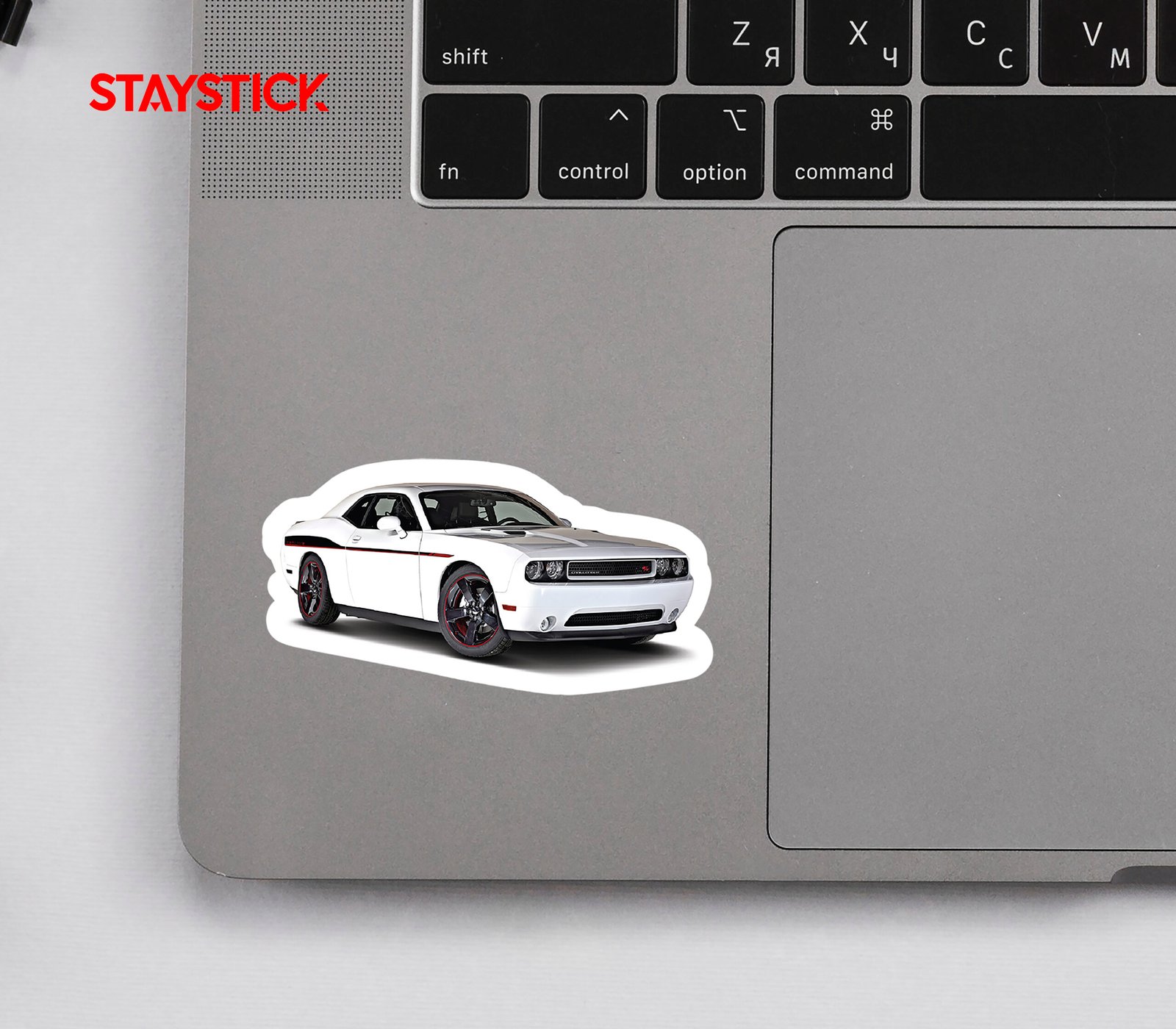 Premium vinyl sticker of a white Dodge Challenger RT with black and red stripes.