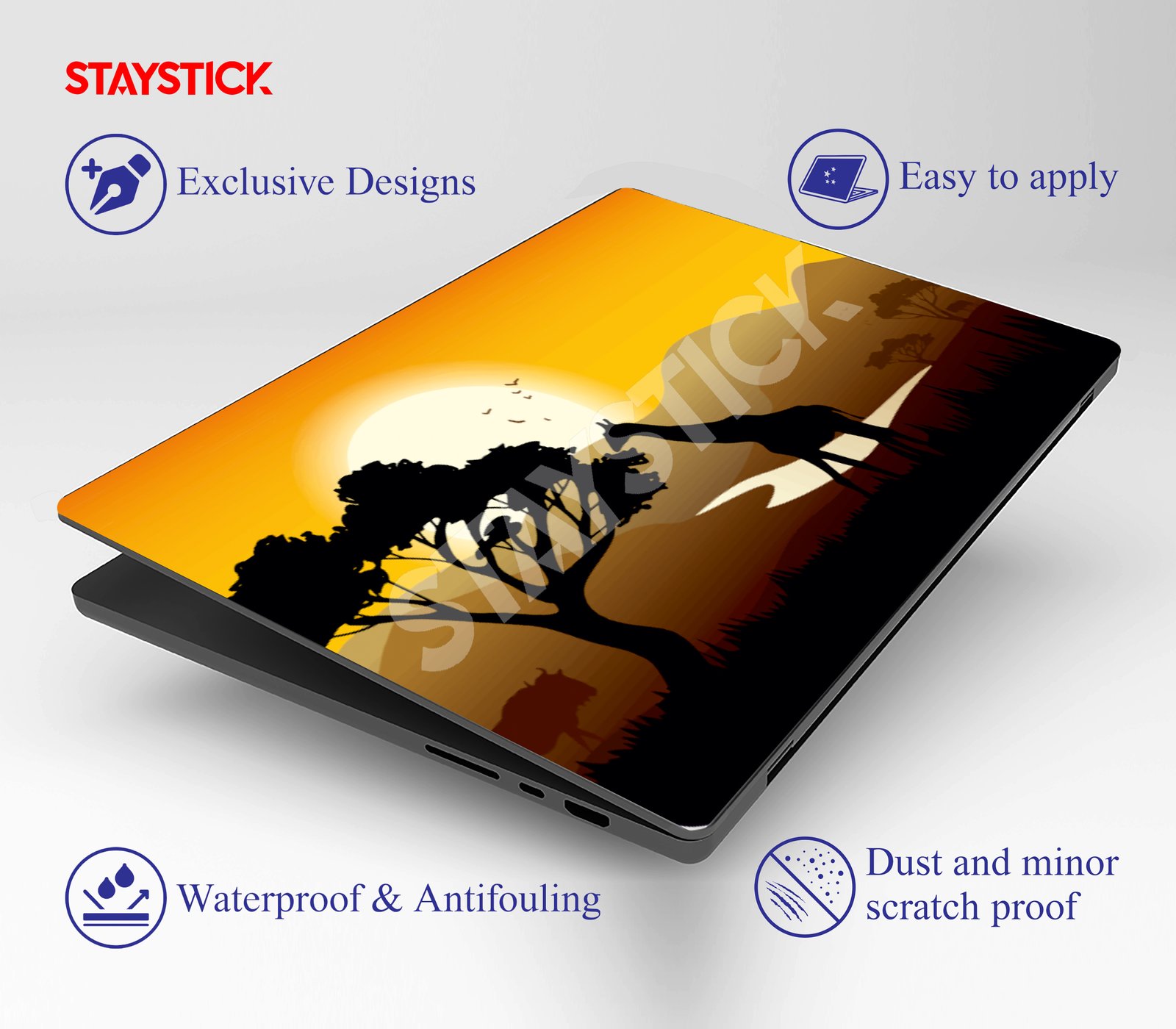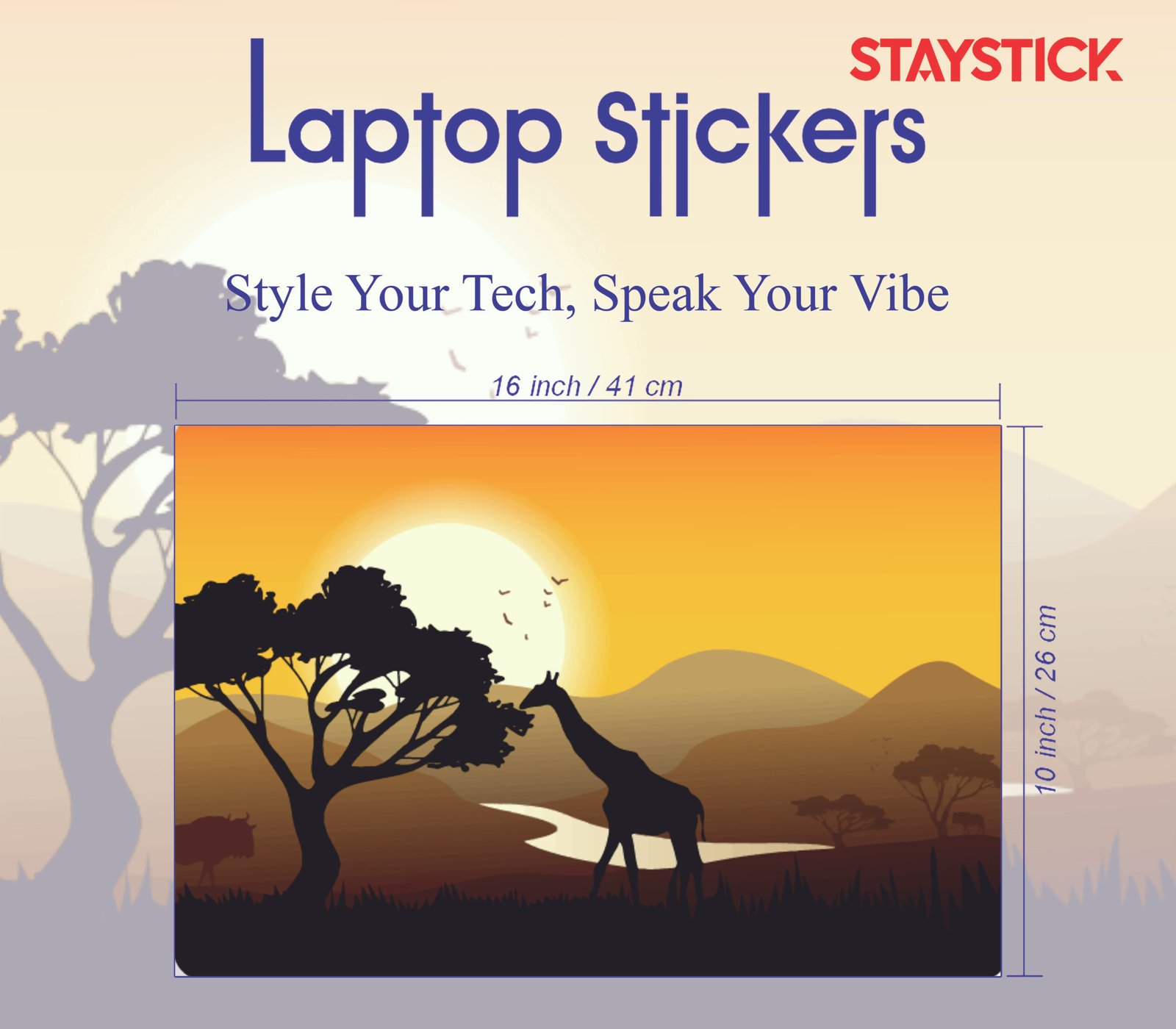 Bring the beauty of the African savanna to your laptop with this stunning sunset silhouette design.”A serene landscape of wildlife and golden skies, perfect for nature lovers and wanderers.Transform your laptop into a canvas of adventure with this elegant savanna sunset skin.