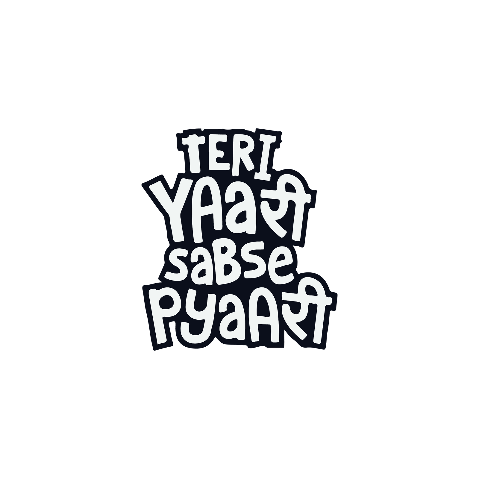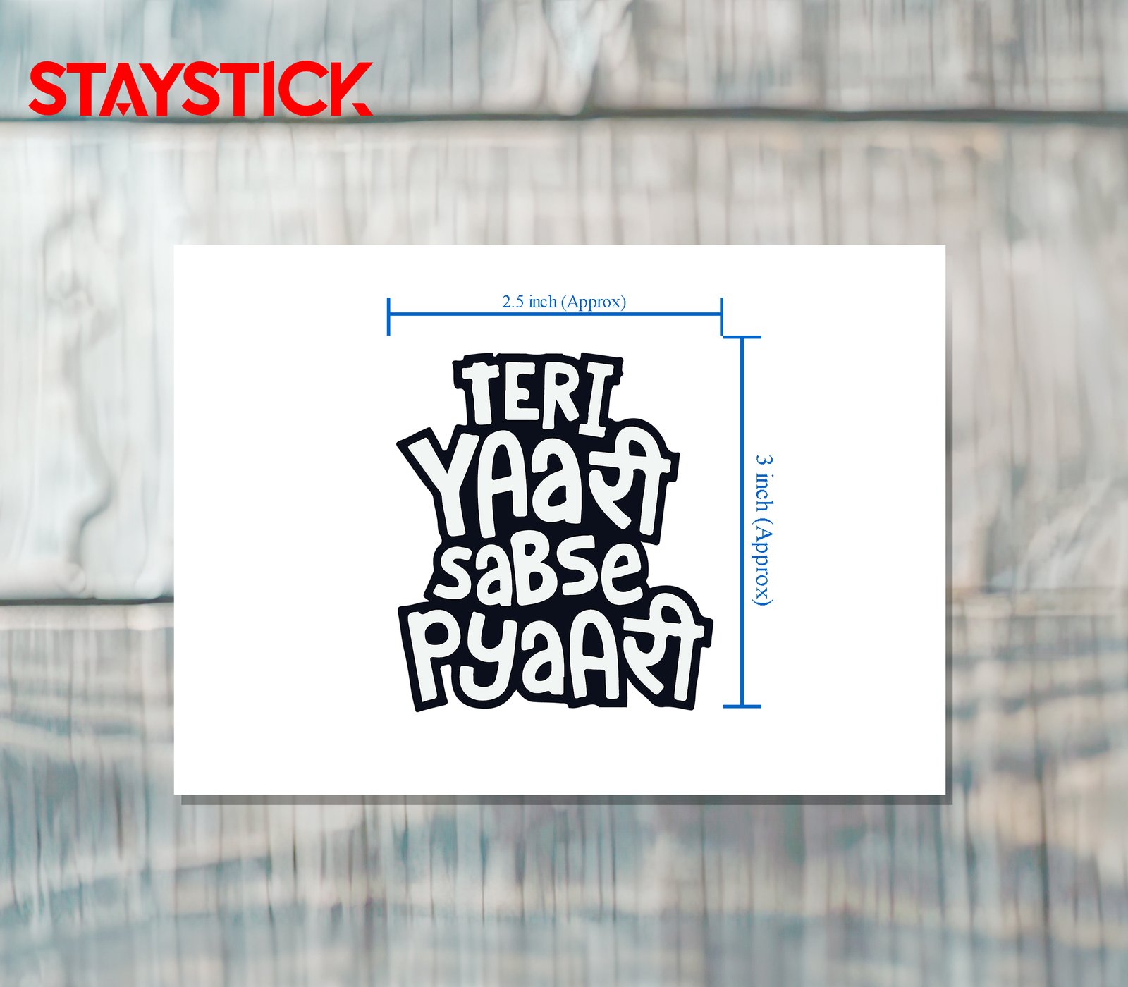 Die-cut typographic sticker reading “TERI YAARI SABSE PYAARI” in playful stacked lettering.