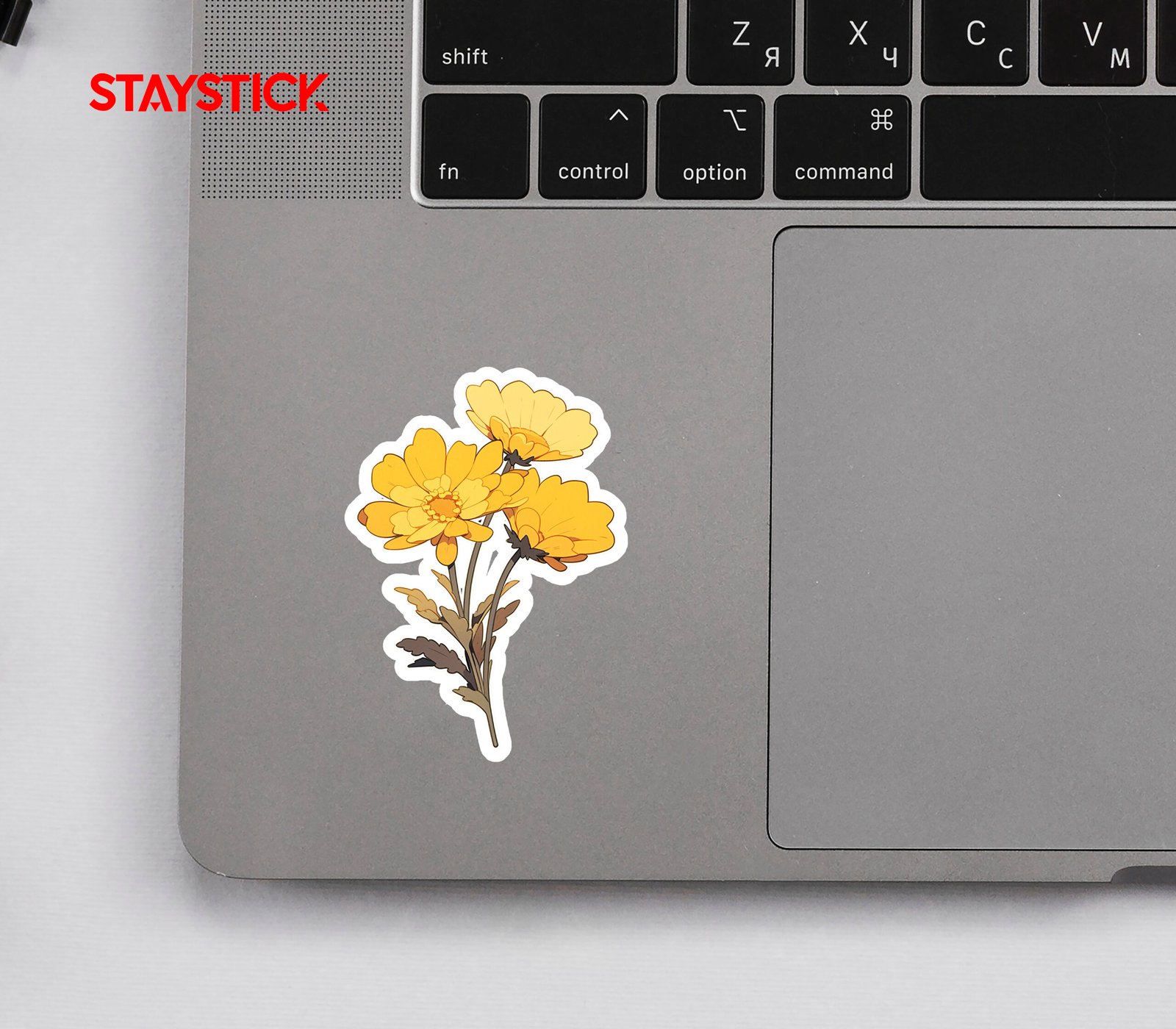Illustrated bouquet of multiple yellow blossoms and tiny filler flowers layered over deep indigo–charcoal foliage. Clean line details and subtle petal veins give depth while maintaining a simplified, print-friendly silhouette. Generous white die-cut trim ensures strong contrast on any surface; ideal for vinyl stickers, stationery seals, or merch.