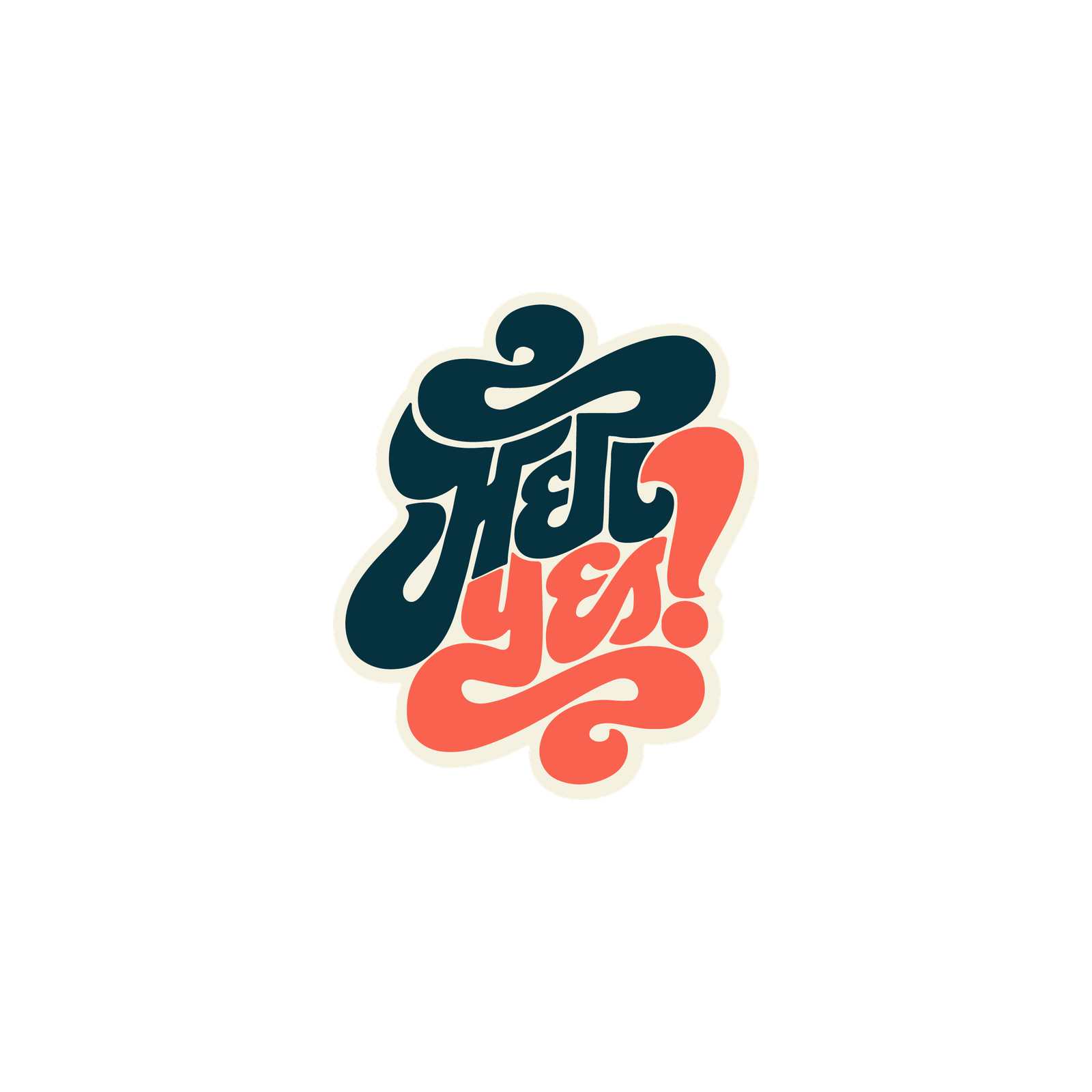 Compact, hand-drawn typographic sticker combining a chunky, calligraphic Devanagari-inspired word in deep teal stacked over a flowing coral “yes!” The two-tone layout uses oversized swashes and rounded terminals to form a cohesive badge silhouette, finished with a soft cream trim for easy die-cut printing.