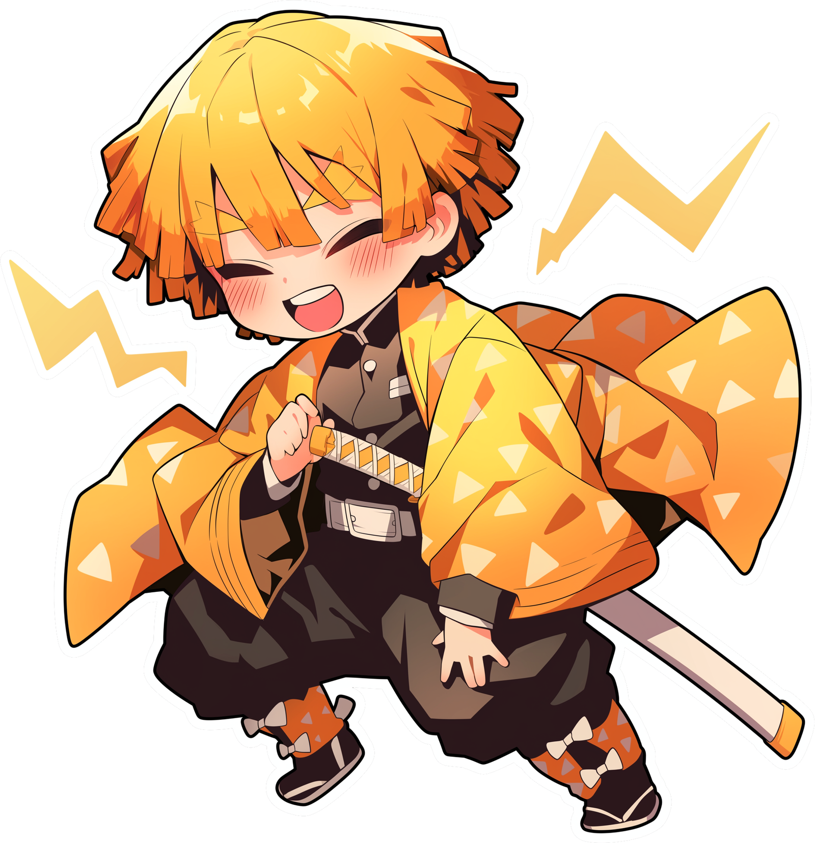 A cute chibi-style sticker of Zenitsu Agatsuma from Demon Slayer, smiling brightly with lightning effects around him.