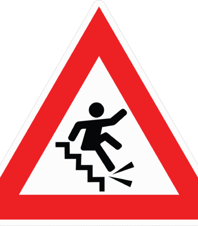A triangular warning sticker with a red border showing a person slipping on stairs, indicating a “Caution – Risk of Falling” hazard.