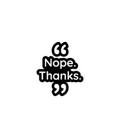 This bold and sassy sticker says it all with just two words — “Nope. Thanks.” Perfect for expressing polite refusal with a touch of attitude and style.