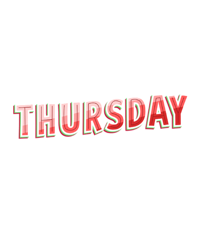 Retro-chrome sticker reading “THURSDAY” in bold pink and red.