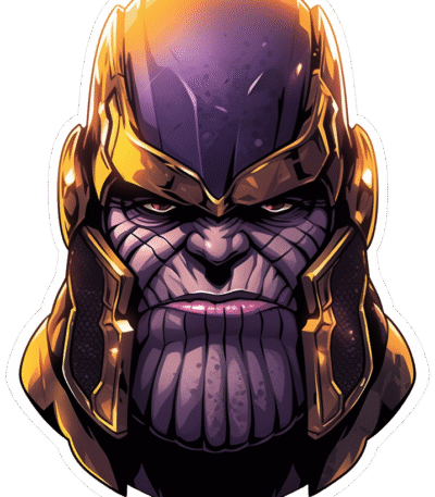 Bold cosmic warlord headshot sticker with metallic gold helmet.