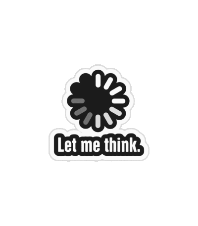 Monochrome die-cut sticker with a circular loading icon above the text “Let me think.”