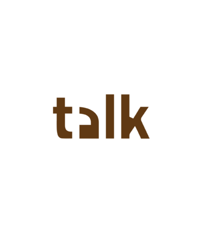 Bold die-cut sticker: the word “talk” in chunky geometric letters, brown fill with thick white trim.