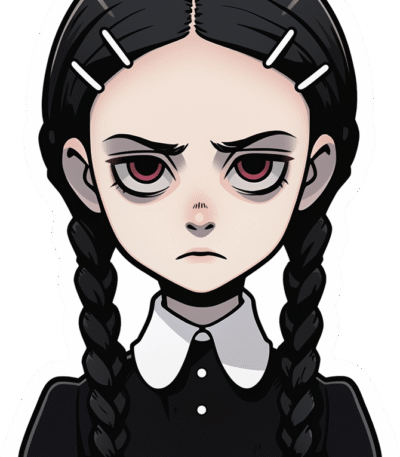 This is a matte dark gray striking sticker of a scary cartoon girl in black braids and a gothic outfit, photographed outdoors with a blurred natural background.